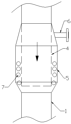目前天然氣廢水處理蒸發(fā)結(jié)晶分離系統(tǒng)中較常使用的固液分離裝置結(jié)構(gòu)如圖1所示,它包括循環(huán)管1、分離管2和清液排出口3,清液排出口3設(shè)置在分離管2頂端,分離管2與循環(huán)管1呈一定角度連接,其工作原理為料液在下降過程中填充分離管2,由于固體顆粒的密度大于液體,因此清液的上升速度快于固體顆粒,當清液上升至清液排出口3排出時,固體顆粒并未到達清液排出口,并且因為分離管2與循環(huán)管1呈一定角度連接,當固體顆粒填充到一定高度還未到達清液排出口時,其填充重量已達到沉降重量,固體顆粒沉降落回循環(huán)管從而實現(xiàn)母液與固體顆粒間的分離。但是該種結(jié)構(gòu)存在如下缺點:固液分離裝置的分離管與循環(huán)管要呈一定角度連接,其尺寸受到限制,并且影響到結(jié)晶分離系統(tǒng)其它設(shè)備的布置,分離效果也差。