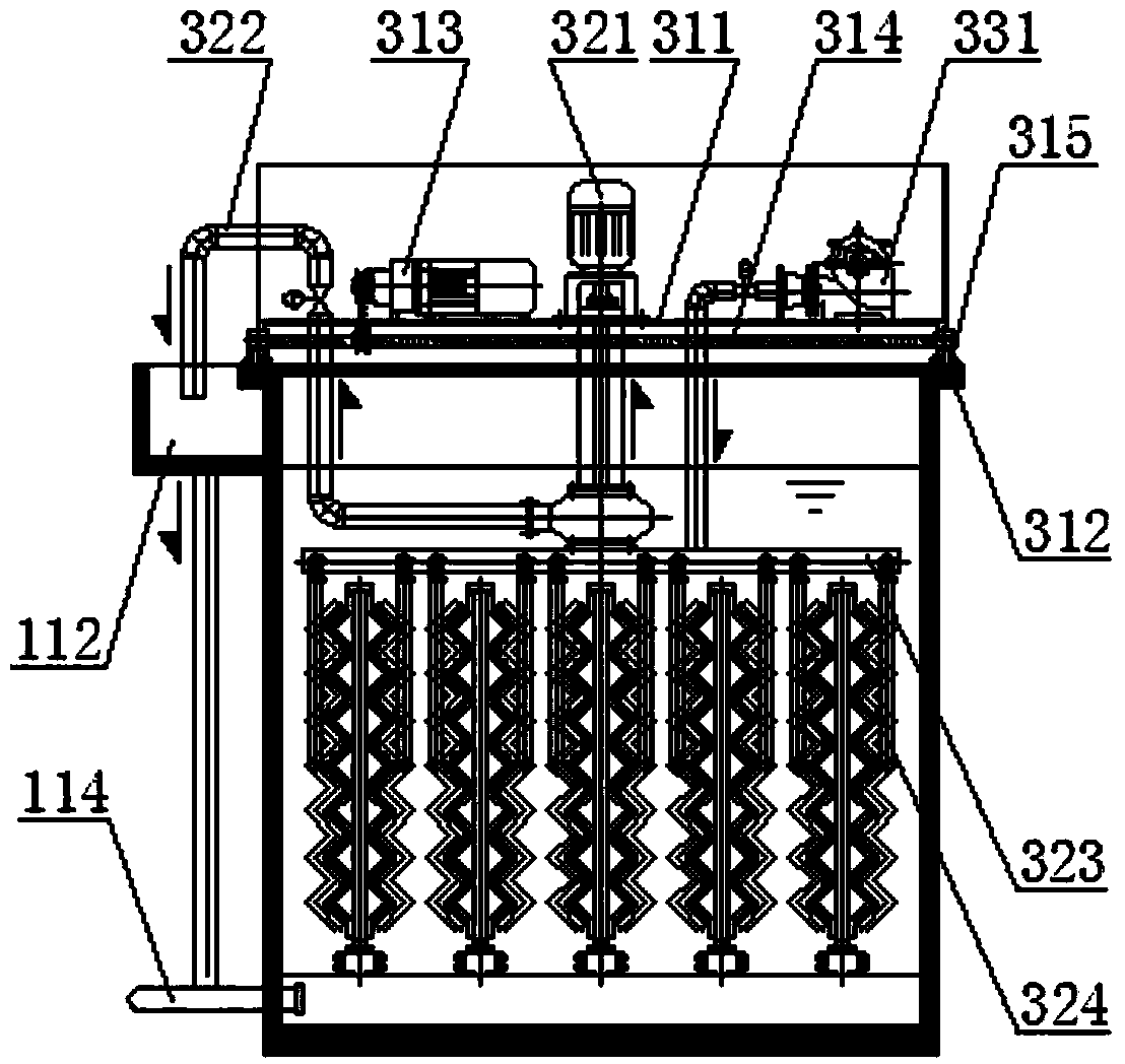 6.根據權利要求3所述的濾布濾池系統(tǒng),其特征在于,所述濾池裝置還包括排放管系,所述排放管系包括設置在所述污水處理區(qū)上部邊緣外側的排泥槽(112)和排泥總管(113),反沖洗所得雜質顆粒依次通過輸泥管(322)、排泥槽(112)和排泥總管(113)排出;所述污水處理區(qū)下部側壁上設有排泥管(114),排泥管(114)與排泥總管(113)密封連通,所述污水處理區(qū)內沉淀所得雜質顆粒依次通過排泥管(114)和排泥總管(113)排出;所述濾后水積水區(qū)下部側壁上設有放空管(121),放空管(121)與排泥總管(113)密封連通,所述濾后水積水區(qū)內積存的濾后水依次通過放空管(121)和排泥總管(113)排出。