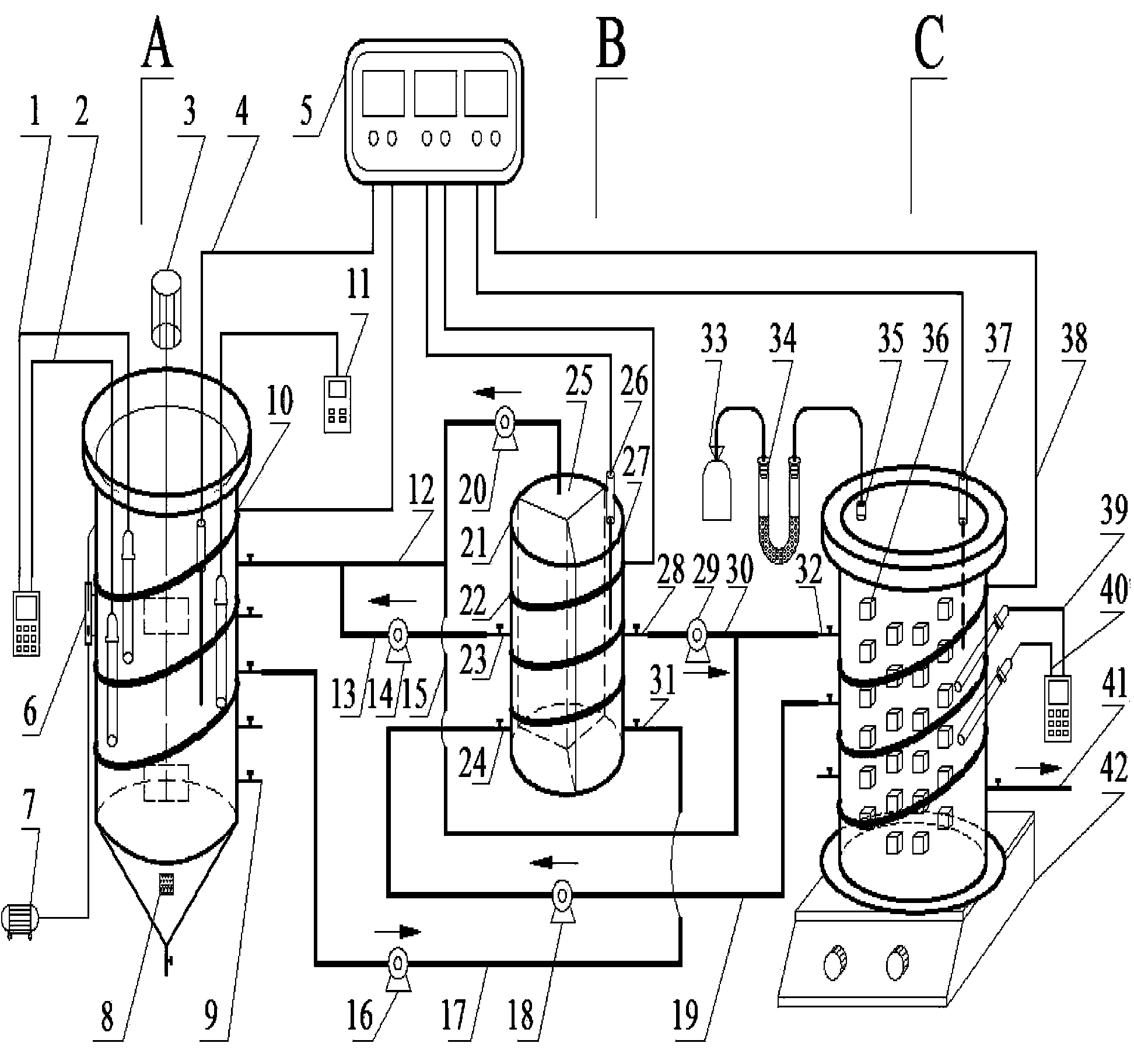 C-SBBRANAMMOX:15-SBBRANAMMOX進水管、18-SBBRANAMMOX出水回流泵、 19-SBBRANAMMOX出水回流管、32-第二取樣閥、33-集氣袋、34-干燥管、35-排氣口、36- 海綿填料、37-第三溫度傳感器、38-第三控溫加熱帶、39-第二ORP儀、40-第二pH儀、 41-SBBRANAMMOX出水管、42-磁力攪拌儀。