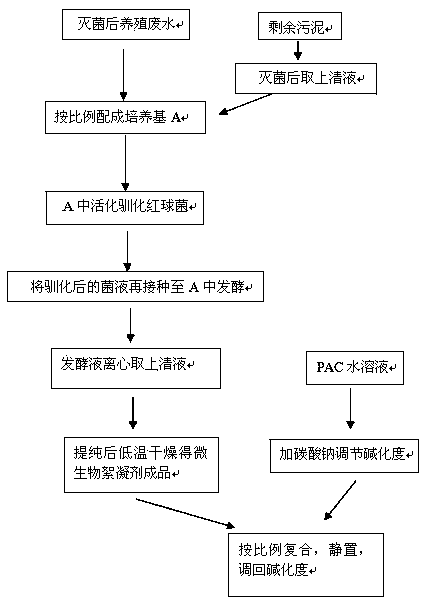 本發明涉及一種由生物絮凝劑(MBF-R)和聚合氯化鋁(PAC)復合而成的復合絮凝劑的制備方法,具體包括:將剩余污泥和養殖廢水分別在高溫滅菌,然后取滅菌后污泥上清液和養殖廢水按比例混合成培養基A,將紅平紅球菌接種至培養基A中活化馴化,馴化后,菌液接種至一個新的培養基A于發酵培養;直接將離心后的發酵液上清液與調好堿化度的PAC按體積比1:(6-11)的比例混合。本發明方法避免了傳統培養基高成本的不足,產品在酸性pH下也能有較好的絮凝效果,降低了PAC的投加量至少30%,降低了廢水絮凝處理的成本。