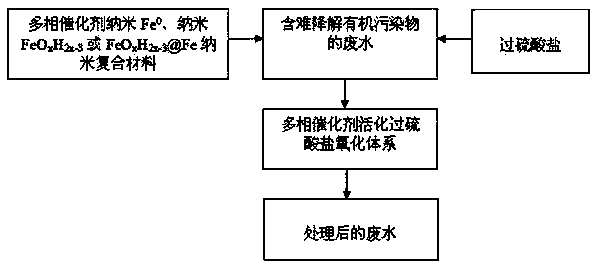 2.根據(jù)權(quán)利要求1所述的一種利用多相催化劑高效活化過(guò)硫酸鹽處理有機(jī)廢水的方法,其特征在于:所述的多相催化劑包括納米Fe0、納米FeOOH、納米Fe2O3、納米Fe3O4、納米FeOOHFe0、納米Fe2O3Fe0或納米Fe3O4Fe0。