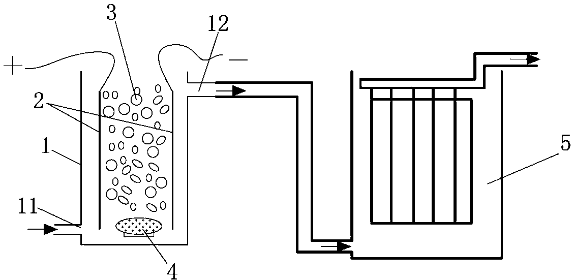 為達到上述目的,本實用新型所提出的技術方案為一種雙電解結合MBR水處理裝置,包括MBR反應器;其特征在于:還包括一雙電解裝置,所述的雙電解裝置包括一罐體、罐體下部設有一進水口,下部設有一出水口,所述的罐體內設有電極,所述的罐體內還填充有鐵碳球;所述的罐體出水口與MBR反應器相連。