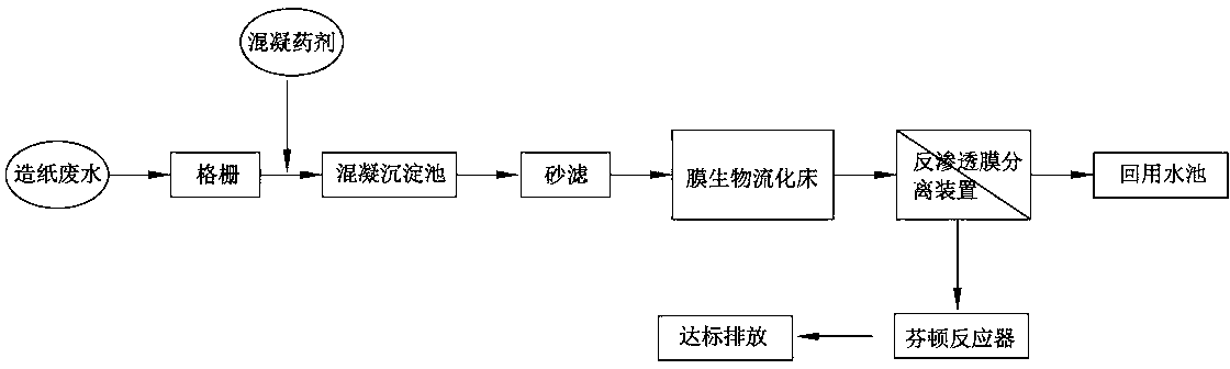 5.根據(jù)權(quán)利要求1-4任一權(quán)利要求所述的造紙廢水深度處理及回用裝置,其特征在于:還包括一芬頓反應(yīng)器,所述的反滲透膜分離裝置的濃水出口通過管道與芬頓反應(yīng)器連接。