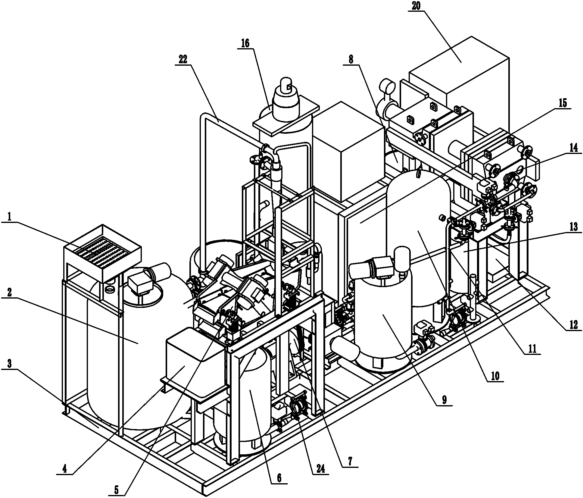 本實用新型提供的一種河湖清淤污泥脫水干化一體化試驗裝置,通過專用設備可以將泥污漿中的水與渣料徹底分離,分離后的渣料可以用普通車輛運輸,而同時可以獲得原河湖底泥污漿中的清水,用來制備藥劑,經過多次試驗從而獲得最佳的添加量,以減少藥劑用量。本實用新型可以通過采用上述的裝置和方法進行多種處理流程的分析,從而尋找出在處理不同種類的河湖底泥污漿時的最佳處理流程,在確保處理效果的前提下,盡量降低治理成本。并可以同時測試在此種處理流程下的藥劑的配方及用量,尋找出最經濟有效的處理成本,以指導工程的應用。本實用新型的裝置中,將多種設備結構緊湊,集成度高的設置在底架上,便于移動到現場進行試驗,且各個設備的組合互相支持,不同的組合為多種治理流程的試驗分析提供了基礎。充分利用了自身分離后產生的清水,以進一步為工程應用提供指導,并減少水資源的浪費。本實用新型的裝置通過設置的液位計、流量計和壓力計,與可變頻控制的電機配合,實現了可調整參數的自動控制,且各執行機構動作均由PLC控制自動完成,大幅降低了試驗過程中的勞動強度。