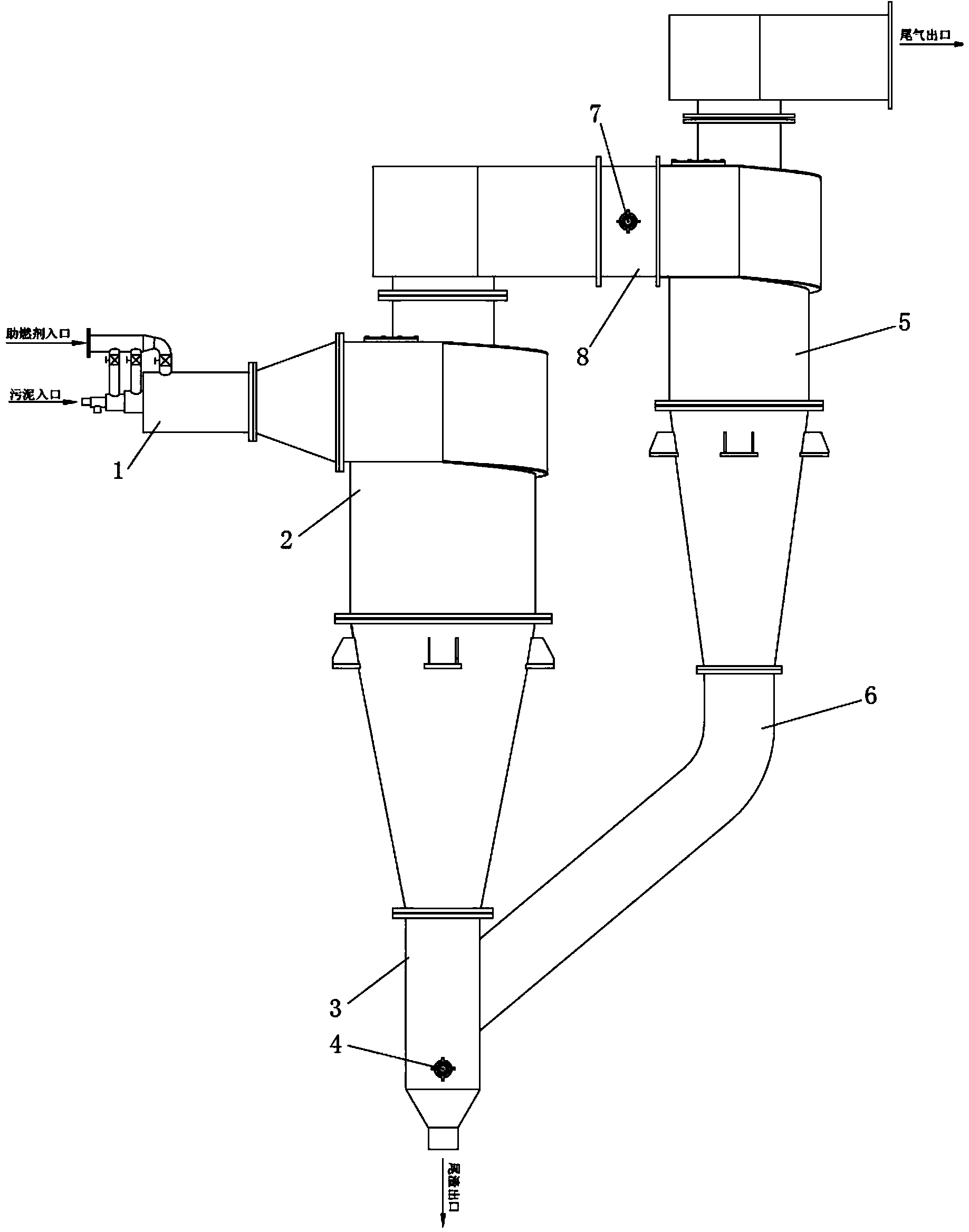 本實用新型的有益效果為:1、不產生有害氣體排放。氣體排放前經高溫等離子火炬 整理,有效去除其中的氮氧化物、硫化物等有害物質;2、不產生有毒氣體。污泥玻璃化 爐內溫度高于1500℃,處理過程中不會產生二惡英、呋喃等有毒物質;3、污泥處理徹 底。處理溫度超過1500℃,高于污泥灰熔點,使污泥實現徹底處置;4、處理后的污泥可 方便進行建材利用。處理后的污泥呈現熔融態,經尾渣出口排出后可經離心法制成建筑保 溫材料巖棉或玻璃砂等,實現污泥的資源化利用。5、裝機功率小,節能環保。整個玻璃 化爐中無動力元件,粉狀污泥經燃燒器噴入后可自持燃燒,充分節約能源。6、適應范圍 廣。可適應于市政污泥、煤泥、工業污泥等各種污泥的處置。7、結構簡單,占地面積小。 本設備采用模塊化設計,占地面積小,且可根據實際情況進行組合。