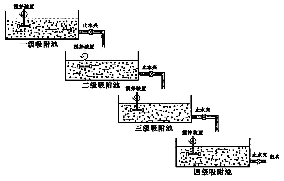 本發明目的在于,針對現有含汞廢水處理方法尤其是活性炭吸附法所存在的吸附性能 差、吸附柱更換頻率高、廢水處理成本高、存在二次污染等方面的缺點,提供一種利用脫 汞吸附材料處理含汞廢水的方法。該方法采用依次相連的多級吸附池對含汞廢水進行處 理,并借助機械攪拌將含汞廢水混合均勻,以提高除汞效率。本發明所述方法能有效處理 高、低濃度的含汞廢水,使出水達到或低于國家排放標準,進而消除汞隨污水外排而造成 對周圍環境的污染。本發明尤其適合用于電石法聚氯乙烯生產、鉛鋅礦冶煉、混汞煉金等 涉汞行業產生的含汞廢水的有效處理。