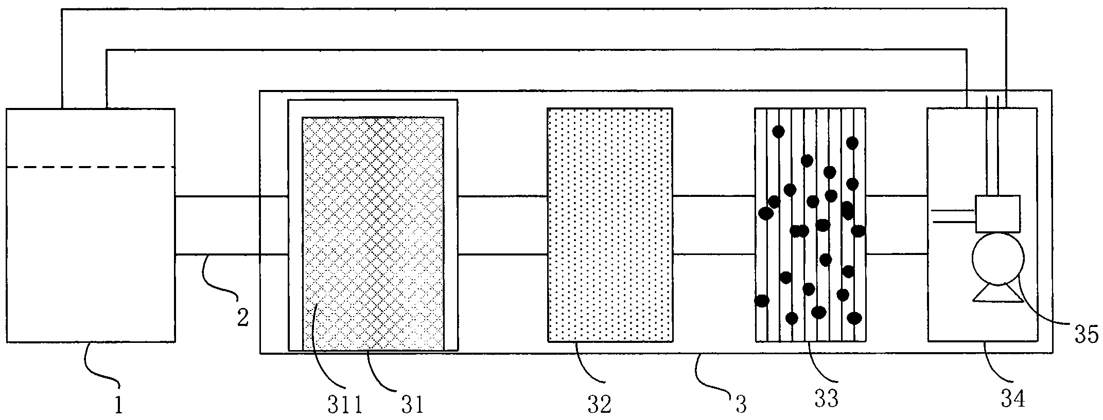 所述過濾池進(jìn)一步包括一次過濾池、二次過濾凈化池、三次過濾凈化池;所述一次過濾池、二次過濾凈化池、三次過濾凈化池之間通過管道連接;
