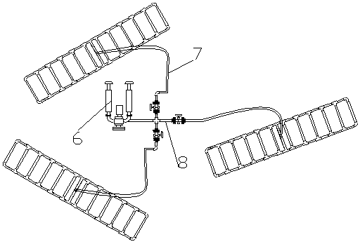 本實用新型公開了一種污水處理曝氣系統,包括風機,多通閥,聯接管道,多個污水處理曝氣管道裝置;所述風機與所述多通閥其中一個閥口相聯,所述多通閥剩余閥口通過所述聯接管道與多個所述污水處理曝氣管道裝置相聯;采用以零拼整的思路,通過將整體分解成具有單獨功能的標準件,在需要的時候進行拼接,不僅在運輸過程中變得更加便利,而且能夠根據所需處理面積上也能夠現場進行調節,同時,在風機和污水處理曝氣管道裝置之間采用管道聯接,尤其是軟管聯接,可以自由的對污水處理曝氣管道裝置所放置的位置進行方便調節,因此,在靈活性和降低成本上都有明顯的優勢。