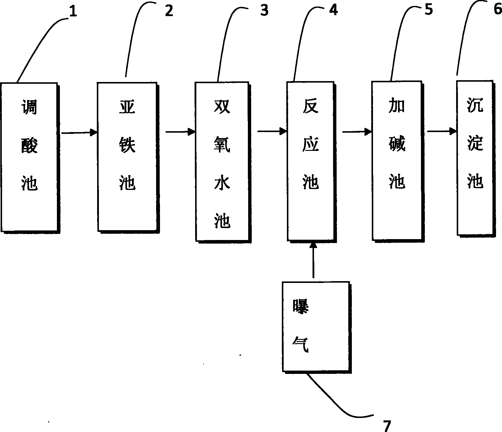 本實用新型解決其技術問題所采用的技術方案是:本實用新型芬頓法處理廢水裝置,所述裝置按順序依次連接有調酸池、亞鐵池、雙氧水池、反應池、調堿池、沉淀池,所述反應池接有曝氣裝置。