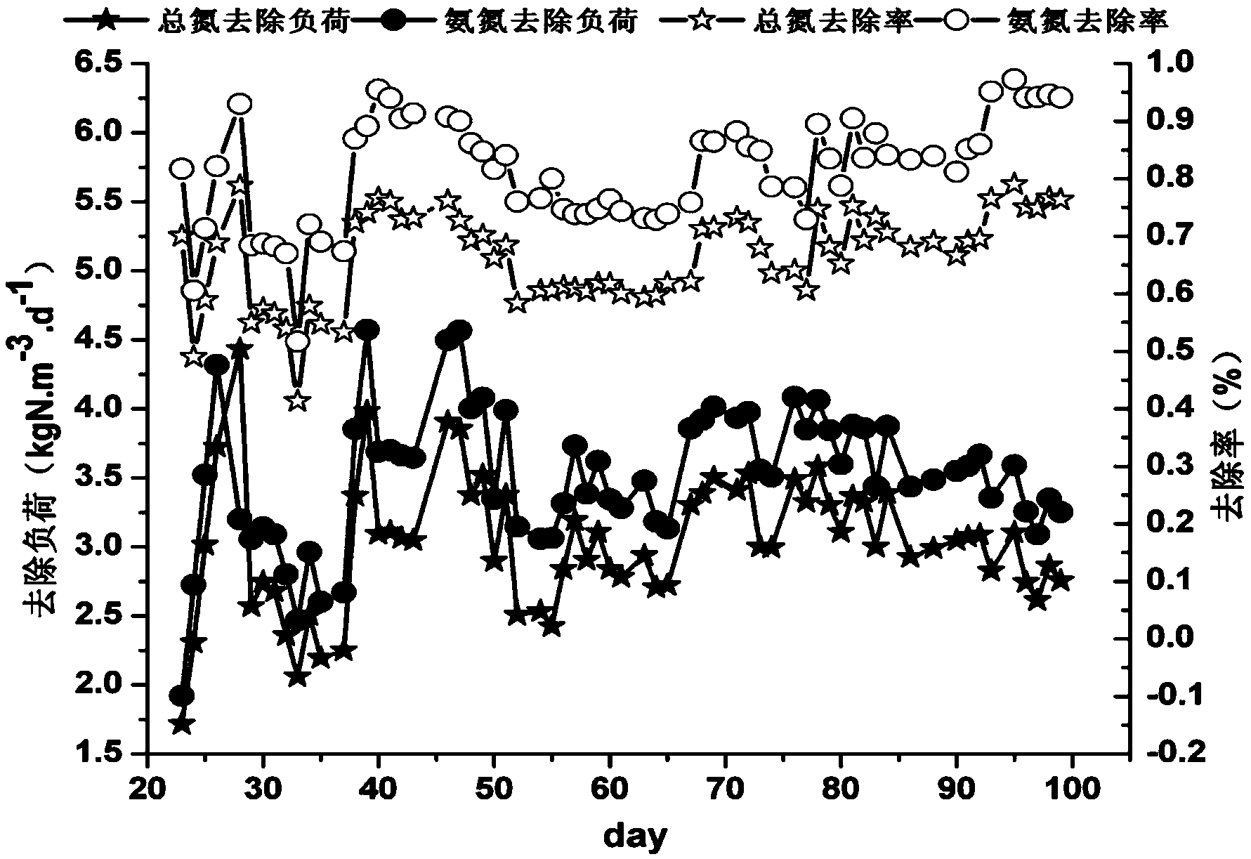 本發(fā)明通過高氨氮CANON污泥掛膜——中氨氮CANON穩(wěn)定運行——低 C/N限氧SNAD啟動的方法,通過對水力停留時間和曝氣量的控制,在實現(xiàn)較 高氮素去除率的基礎上,在較短的時間內實現(xiàn)了CANON工藝高負荷運行,并 且縮短了常溫低C/N污水SNAD反應器的啟動時間。啟動過程操作簡單,容易 控制,以本發(fā)明方法啟動反應器,能同時進行脫氮除COD,氨氮及COD去除 負荷分別達到了3.50kg/(m3·d)和0.5kg/(m3·d)以上,達到了較高的同時脫氮除 COD效果。