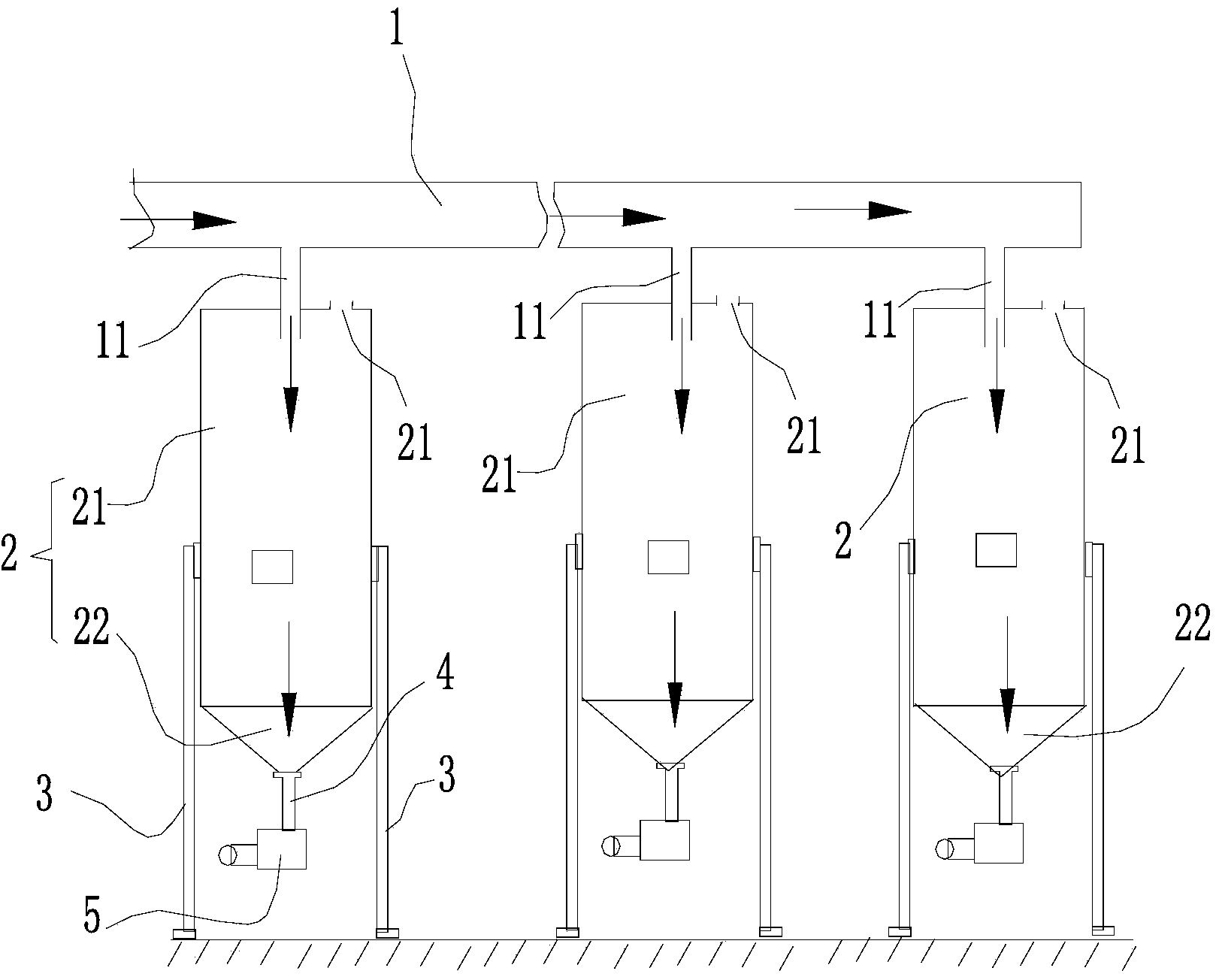 -位于所述泥漿輸送管道下方若干個具有內腔的反應罐體,所述輸出管與所述反應罐體內腔相通;所述反應罐體頂部具有排氣口,所述反應罐體上部為圓柱體,下部為圓錐體;每個所述反應罐體側壁的連接數根向下延伸出一定長度的支撐柱,以使所述反應罐體懸空于地面;