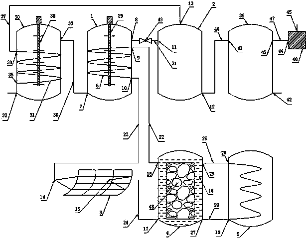 2、根據技術方案1所述的 太陽能高溫熱水解聯合閃蒸脫水污泥處理系統,一個優選的技術方案是:所述的污泥入口一設于加熱罐的罐壁的底部或下部,所述的污泥出口一設于加熱罐的罐壁的中部或上部;所述的污泥入口二設于常壓閃蒸罐的罐壁的中部或上部,污泥出口二設于常壓閃蒸罐的罐壁的底部或下部,蒸汽出口一設于常壓閃蒸罐的罐壁的頂部或上部;所述的導熱油入口一設于加熱罐的罐壁的頂部或上部,導熱油出口一設于加熱罐的罐壁的底部或下部;所述的導熱油入口三設于儲熱罐的罐壁的底部或下部,導熱油出口三設于儲熱罐的罐壁的頂部或上部;所述的導熱油入口四設于輔助加熱器的底部或下部,導熱油出口四設于輔助加熱器的頂部或上部;所述的導熱油入口五設于儲熱罐的罐壁的頂部或上部,所述的導熱油出口五設于儲熱罐的罐壁的底部或下部。