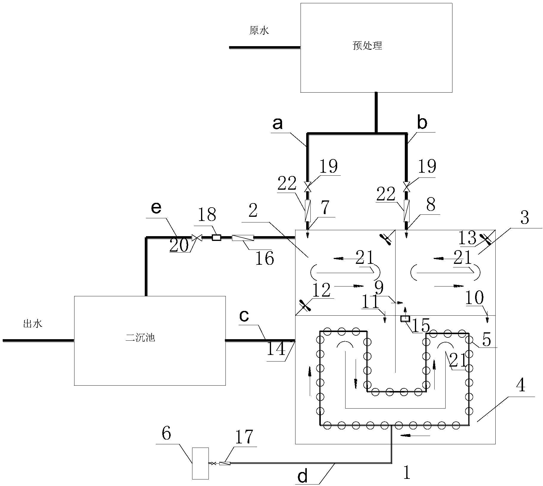 相對于現有技術,本發明具有如下有益效果:從一定程度上解決了傳統硝 化-反硝化工藝存在的問題,通過將各單元污泥分段控制,減少了污泥微生物的 摻混,更大程度發揮了各單元有效菌屬的作用,另外可將整套工藝拆分或組合 進行靈活運行。