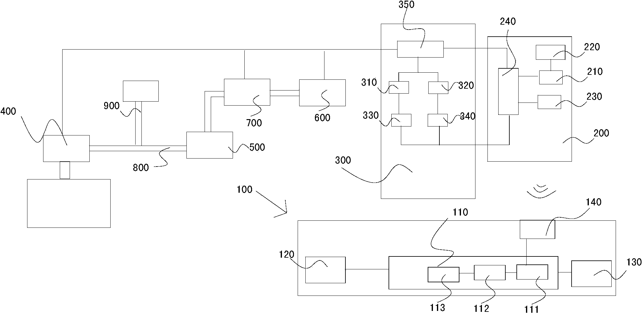 其中,所述交渡端子單元(300)包括:電流變換器(310)、第一濾波裝置(320)、功率變換器(330)、第二濾波裝置(340)和數據傳收器(350),所述電流變換器(310)的輸出端與第一濾波裝置(320)的輸入端連接,所述第一濾波裝置(320)的輸出端與通訊單元(200)的輸入端連接,所述功率變換器(330)的輸出端與第二濾波裝置(340)的輸入端連接,所述第二濾波裝置(340)的輸出端與通訊單元(200)的輸入端連接,所述數據傳收器(350)與水泵(400)、分析儀(600)和采樣器(700)連接。