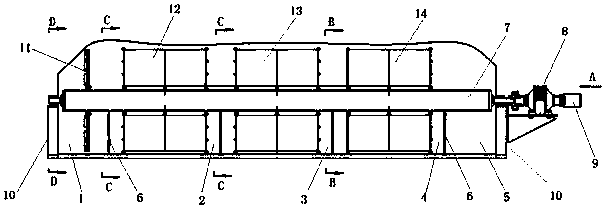 1.一種轉(zhuǎn)輪式小型污水處理裝置,其特征是包括臥式圓柱形的污水倉,主軸(7),電動(dòng)機(jī)(9)和減速器(8),圓柱形污水倉的下半圓由隔板(6)依次分隔為五個(gè)分倉(1-5),隔板(6)上有進(jìn)出水口(16),前一個(gè)分倉的出水口是后一個(gè)分倉的進(jìn)水口,五個(gè)分倉的進(jìn)出水口依次有落差,主軸(7)通過軸承安裝在污水倉兩端的支架(10)上,主軸的一端與減速器(8)的輸出軸固定,減速器(8)的輸入軸與電動(dòng)機(jī)(9)的轉(zhuǎn)軸固定,主軸(7)上依次固定有攪拌輪(11),第一轉(zhuǎn)輪(12)、第二轉(zhuǎn)輪(13)和第三轉(zhuǎn)輪(14),攪拌輪(11)位于第一分倉(1)中,第一轉(zhuǎn)輪(12)、第二轉(zhuǎn)輪(13)和第三轉(zhuǎn)輪(14)分別位于第二分倉(2)、第三分倉(3)和第四分倉(4)中,所述的第一轉(zhuǎn)輪(12)、第二轉(zhuǎn)輪(13)和第三轉(zhuǎn)輪(14)均是由若干個(gè)橫截面呈梯形的契形籠(15)拼接成的輪體,其中構(gòu)成第一轉(zhuǎn)輪(12)和第二轉(zhuǎn)輪(13)的每個(gè)契形籠(15)的頂面(23)敞開,前端面(21)和后端面(22)為不銹鋼板,底面(24)以及兩個(gè)側(cè)面為不銹鋼絲網(wǎng),在第一轉(zhuǎn)輪(12)和第二轉(zhuǎn)輪(13)的每個(gè)契形籠(15)內(nèi)裝滿縱向波紋板(25)和橫向波紋板(26),縱向波紋板和橫向波紋板相間排列,第二轉(zhuǎn)輪(13)中的縱向波紋板和橫向波紋板的波紋半徑小于第一轉(zhuǎn)輪(12)中的縱向波紋板和橫向波紋板的波紋半徑,第一轉(zhuǎn)輪(12)和第二轉(zhuǎn)輪(13)分別與污水倉壁之間有4-6厘米的間隙;構(gòu)成第三轉(zhuǎn)輪(14)的每個(gè)契形籠(15)的前端面(21)和后端面(22)為不銹鋼絲網(wǎng),頂面(23)、底面(24)以及兩個(gè)側(cè)面為不銹鋼板,且在第三轉(zhuǎn)輪(14)的每個(gè)契形籠(15)中充滿木質(zhì)作物碎片填料,在第三轉(zhuǎn)輪(14)的前端面固定圓環(huán)形擋水板(17),圓環(huán)形擋水板與污水倉壁之間的間隙小于1mm。