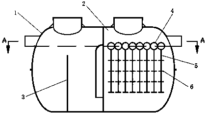 1.浮子式污水預處理裝置,包括化糞池(1)和厭氧菌處理槽(2)兩部分,其中化糞池由沉淀槽和發酵槽組成,沉淀槽和發酵槽的上半部連通,下半部有分隔板(3),其特征是厭氧菌處理槽(2)中分布有獨立的浮子(4),在浮子底部的吊環上吊有吊桿(5),吊桿(5)上固定有附著厭氧菌的掛件(6)。