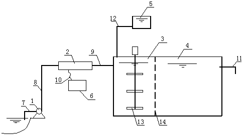 所述水處理池包括反應(yīng)池、沉淀池,反應(yīng)池的進(jìn)口通過(guò)水池進(jìn)水管連接無(wú)破損超聲器的出口,反應(yīng)池、沉淀池為開(kāi)口的矩形水池;反應(yīng)池與沉淀池之間用開(kāi)孔板分隔;反應(yīng)池中安裝有攪拌器,在沉淀池末端墻壁上安裝有水池出水管。