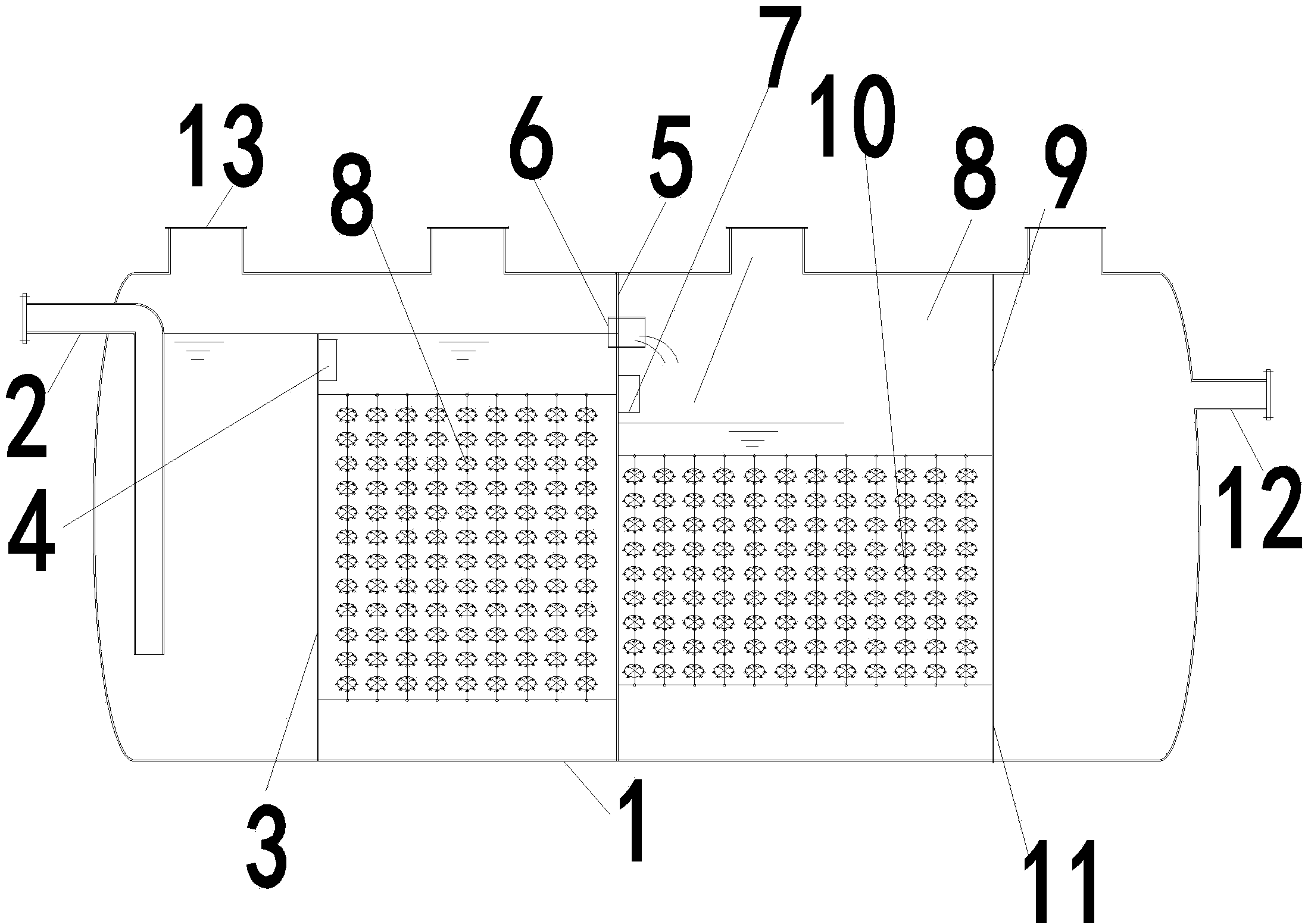 6、本實用新型中的處的跌水管,下方為第一彈性立體填料,此區(qū)域為兼氧區(qū),兼氧區(qū)應(yīng)有較好的空氣進入渠道與保證污水和空氣的充分接觸面積,才能使污水處于兼氧狀態(tài),從而達到去除NH3-N的目的,有落差,既可以保證進出水的順暢,同時也可以有一定的跌落曝氣過程,提高污水中溶解氧濃度。