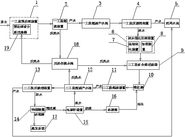 作為優(yōu)選,步驟1)所述的一工段預(yù)處理裝置包括混凝加藥斜板、機械攪拌澄清池、預(yù)處理多介質(zhì)過濾器、臭氧、活性炭吸附之一種或多種組合。