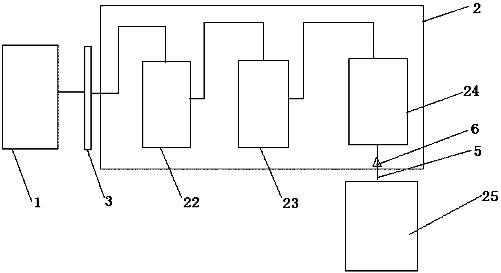 所述曝氣池的輸出口連接所述生物反應(yīng)池的輸入口,所述生物反應(yīng)池 的輸出口連接所述MBR膜處理組件的輸入口,所述MBR膜處理組件的 輸出口連接所述消毒裝置的輸入口,所述消毒裝置的輸出口通過管道連接 有貯水池,所述管道上設(shè)置有電磁閥;
