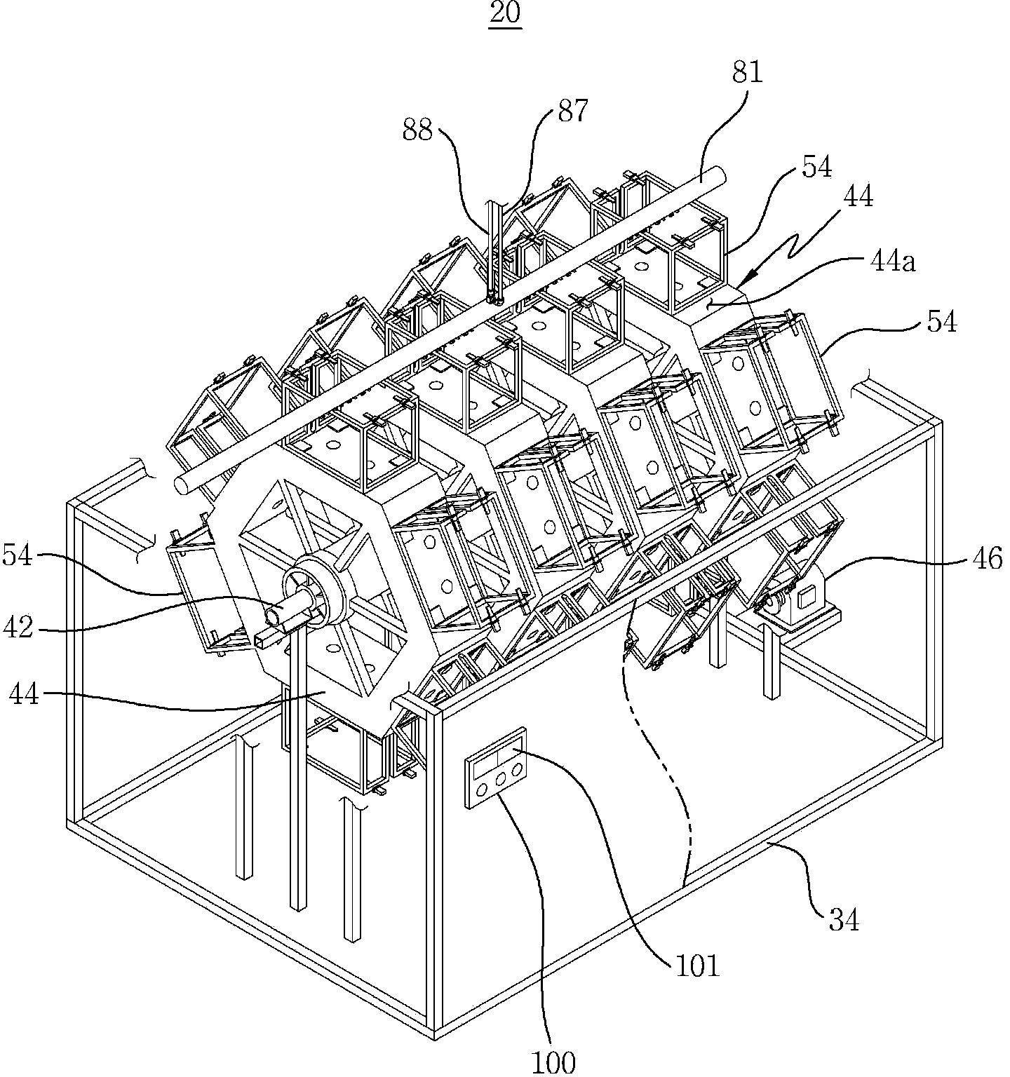 設置框(54),以前后、左右及上部、下部開放的方式組裝成正六面體,設置于上述旋轉臺車(44)的角面(44a),在上述設置框(54)的下端的邊角設置有支撐臺(52),盒本體(12)的下端穩定地放置于上述支撐臺(52);以及