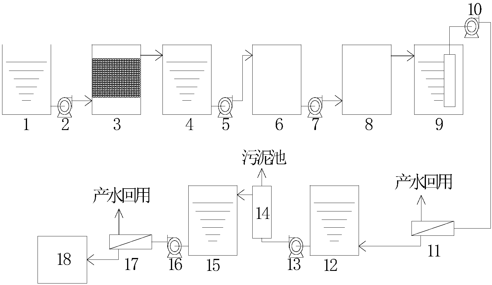 本發(fā)明涉及工業(yè)廢水處理領域,具體是一種電鍍廢水零排放處理工藝及其裝置,處理工藝包括以下步驟:1)電鍍廢水首先進入微電解系統(tǒng),進行鐵碳微電解處理;2)經(jīng)過上一步處理后,進行除重金屬處理;3)經(jīng)過上一步處理后,進入生化系統(tǒng),進行微生物分解處理;4)經(jīng)過上一步處理后,進入平板陶瓷膜池進行過濾;5)經(jīng)過上一步過濾后,進入反滲透系統(tǒng)進行過濾;6)經(jīng)過上一步過濾后,淡水回用于生產(chǎn),濃水加堿軟化后進入管式陶瓷膜過濾;7)經(jīng)過上一步過濾后的產(chǎn)水進入二次膜濃縮設備進一步濃縮,淡水回用,濃水進入蒸發(fā)設備蒸發(fā),最后結晶成固體鹽。本發(fā)明實現(xiàn)了電鍍廢水的零排放。