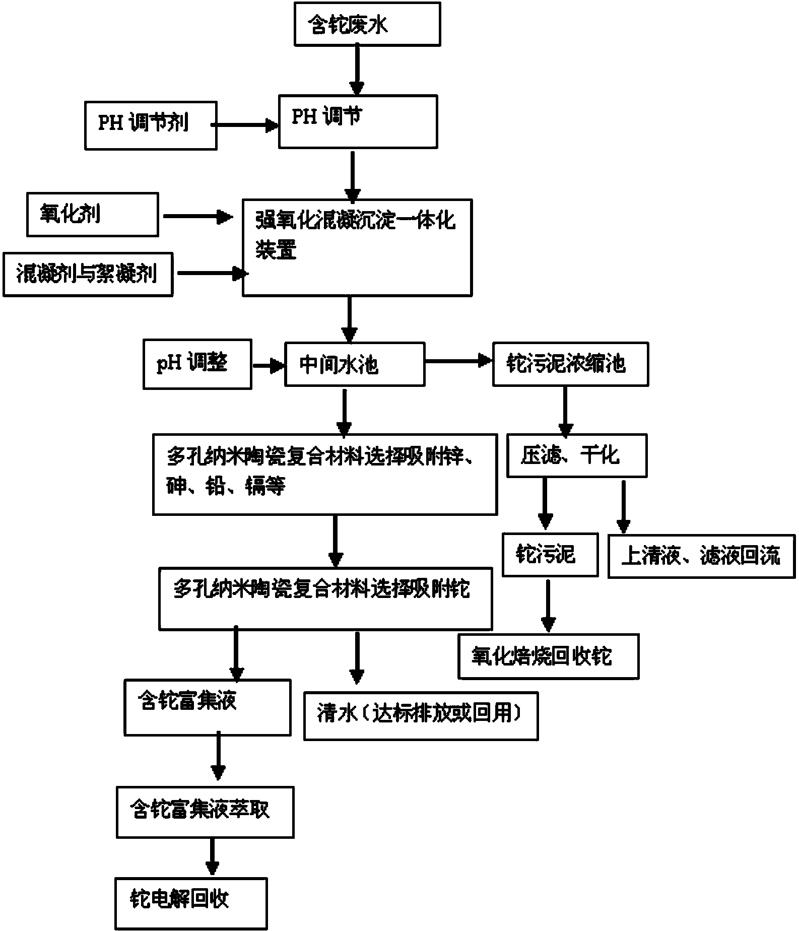 含鉈廢水強氧化混凝與吸附回收工藝,包括集中含鉈廢水,pH調(diào)節(jié),強氧化,混凝、絮凝,沉淀污泥處理,pH調(diào)整,固體雜質(zhì)過濾,除Zn、Pb、Cd、Tl等工序,本發(fā)明的有益效果是技術(shù)先進(jìn)、工藝成熟、出水水質(zhì)好、運行穩(wěn)定、工藝簡潔、實用性強、啟停容易、維護(hù)管理方便,投資少、運行成本低、建設(shè)占地面積小、建設(shè)工期短,項目適應(yīng)范圍廣處理重金屬離子污水不受溫度的限制,可以解決生物法在北方寒冷地區(qū)無法運行的局限性。