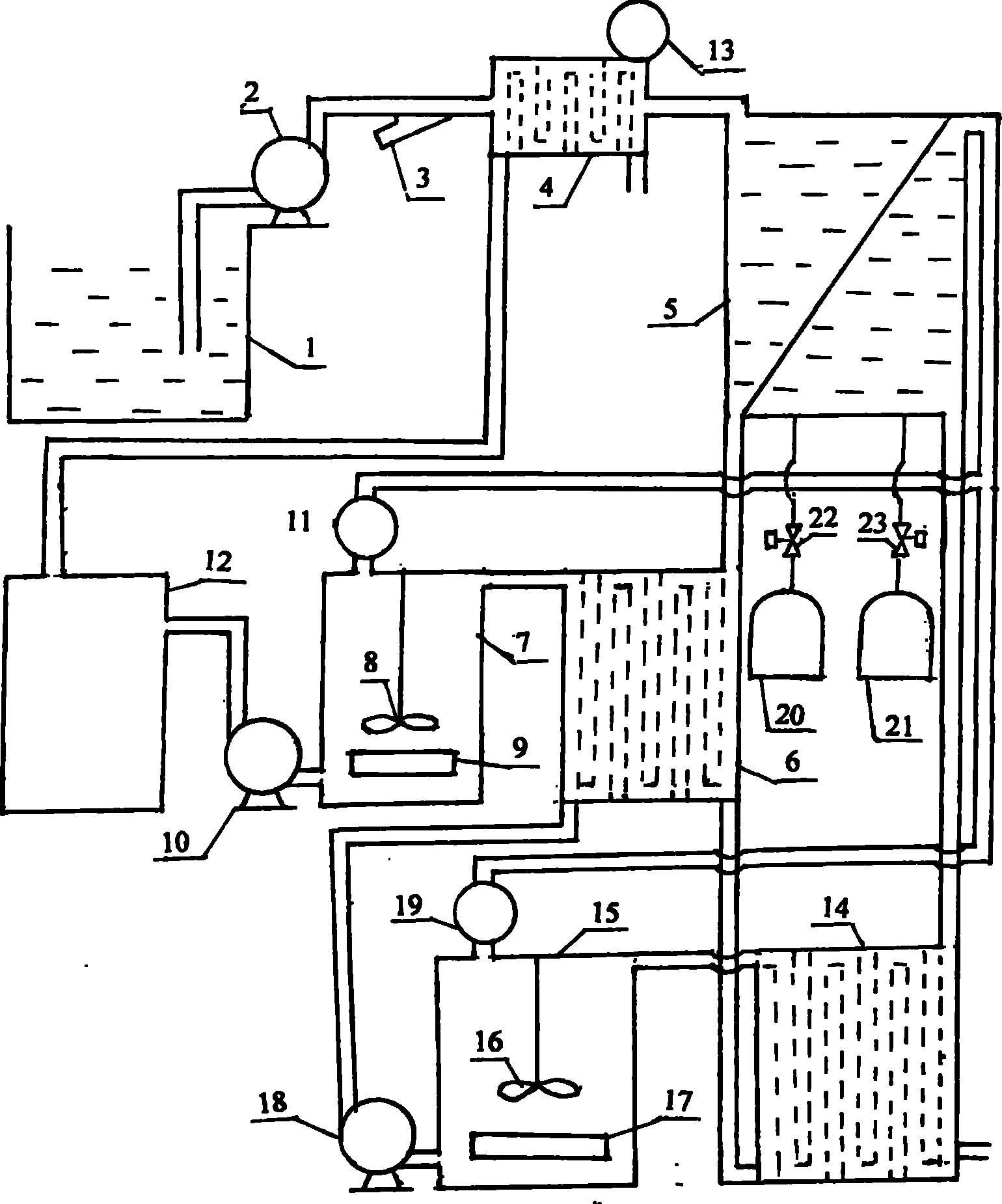 2.正滲透法工業污水處理的工業流程,其特征在于:正滲透法工業污水處理的工藝流程 如下:淡污水泵(2)從淡污水池(1)里抽取的淡污水經過過濾器(3)被過濾,再經過水蒸 氣冷凝器(4)的冷水區被加熱,然后無壓或者微壓的淡污水進入正滲透工業污水處理器(5) 中的正滲透膜芯中;從二氧化碳儲氣罐(20)的出氣管出來的二氧化碳高壓氣體經過通電打 開的二氧化碳電磁閥(22)進入正滲透工業污水處理器(5)的中水區,從氨氣儲氣罐(21) 的出氣管出來的氨氣經過通電打開的氨氣電磁閥(23)也也進入正滲透工業污水處理器(5) 的中水區,二氧化碳和氨氣進入正滲透工業污水處理器(5)的中水區后在中水里發生化學反 應生成碳酸氫銨的無機鹽溶液,在中水區碳酸氫銨鹽的濃度是正滲透膜芯里的無機鹽溶液濃 度的五倍,在正滲透工業污水處理器(5)中正滲透膜芯中的中水穿過正滲透膜進入中水區, 中水區的碳酸氫銨溶液穿過正滲透膜進入正滲透膜芯中、以達到兩個區的無機鹽的濃度平衡; 正滲透膜芯里碳酸氫銨的部分銨離子與重金屬離子形成絡合物很容易溶解在污水里,含有碳 酸氫銨的濃污水從正滲透工業污水處理器(5)中的正滲透膜芯下端流出,含有碳酸氫銨的中 水從正滲透工業污水處理器(5)的中水區的出水管流出,流到中水冷熱交換器(14)的冷水 區被加熱,然后進入太陽能加熱器被加熱到70℃再進入中水罐(15)或者直接進入中水罐 被中水工業余熱加熱器(17)加熱到70℃,中水罐(15)中的中水攪拌器(16)使中水均 勻加熱,碳酸氫銨在中水罐(15)中受熱分解生成二氧化碳和氨氣上升到中水罐(15)的頂 部,中水真空風機(19)把中水罐(15)頂部的二氧化碳和氨氣抽送到正滲透工業污水處理 器(5)的中水區,二氧化碳和氨氣在中水區內重新進行化學反應生成碳酸氫銨被循環利用; 中水泵(18)把中水罐(15)中加熱釋放出二氧化碳和氨氣后的熱中水抽到中水與濃污水冷 熱交換器(6)中的熱水區,在中水與濃污水冷熱交換器(6)里熱中水釋放出大量的熱量加 熱了從正滲透工業污水處理器(5)的正滲透膜芯下端出來后進入中水與濃污水冷熱交換器(6) 冷水區的濃污水,從中水與濃污水冷熱交換器(6)的熱水區出來的帶有余熱的中水進入中水 冷熱交換器(14)中的熱水區加熱從正滲透工業污水處理器(5)的中水區出來后進入中水冷 熱交換器(6)的冷水區的中水,從中水冷熱交換器(6)里的熱水區出來的中水被直接排放 的下水道中;從中水與濃污水冷熱交換器(6)的冷水區出來的濃污水進入太陽能加熱器在被 加熱到70℃再進入濃污水罐(7)中,或者直接進入濃污水罐(7)中被濃污水工業余熱加 熱器(9)加熱到70℃,在濃污水罐(7)中濃污水攪拌器(8)的攪拌有利于濃污水被均勻 加熱和濃污水里的碳酸氫銨分解成二氧化碳和氨氣聚集在濃污水罐(7)的頂部,濃污水真空 風機(11)把濃污水罐(7)頂部的二氧化碳和氨氣也被抽送到正滲透工業污水處理器(5) 的中水區,二氧化碳和氨氣在中水區內也重新進行化學反應生成碳酸氫銨被循環利用;濃污 水泵(10)把濃污水罐(7)中釋放出二氧化碳和氨氣的熱濃污水抽送到濃污水多效閃蒸凈化 器(12)或者濃污水噴霧式多級閃蒸凈化器中,濃污水被進一步濃縮后流到濃污水沉淀池內 冷卻后的無機鹽溶解度下降析出無機鹽,從濃污水多效閃蒸凈化器(12)或者濃污水噴霧式 多級閃蒸凈化器出來的水蒸氣進入水蒸氣冷凝器(4)的冷凝區中水蒸氣被冷卻生產出大量的 蒸餾水,在水蒸氣冷凝器(4)的冷水區中淡污水被加熱后再進入正滲透工業污水處理器(5) 中正滲透膜芯,淡污水被加熱后粘度減小有利于其中的中水穿過正滲透膜到達中水區。
