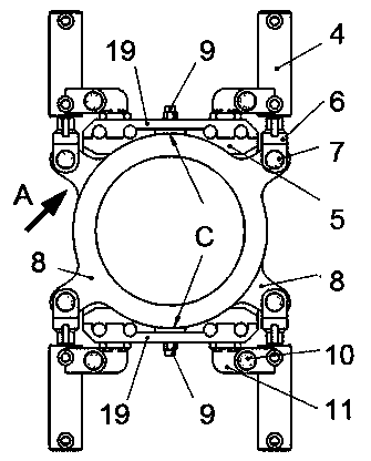 1.一種無(wú)濾布垂直壓縮污泥高壓脫水機(jī)的脫水機(jī)構(gòu),其特征在于:所述的脫水機(jī)構(gòu)的上部與無(wú)濾布垂直壓縮污泥高壓脫水機(jī)的進(jìn)料壓縮機(jī)構(gòu)相連通,下部與無(wú)濾布垂直壓縮污泥高壓脫水機(jī)的出料機(jī)構(gòu)相連通;所述的脫水機(jī)構(gòu)具有由若干個(gè)脫水環(huán)片(8)上下設(shè)置并連接為一體構(gòu)成的脫水腔;由若干個(gè)脫水環(huán)片構(gòu)成的所述脫水腔由脫水腔底座支撐在出料機(jī)構(gòu)上;所述的脫水環(huán)片(8)上具有向外伸出的凸耳;脫水環(huán)片上(8)的所述凸耳為對(duì)稱設(shè)置的兩個(gè);上下相鄰兩個(gè)脫水環(huán)片(8)交叉放置將若干個(gè)上下設(shè)置的脫水環(huán)片分(8)為兩組,每組脫水環(huán)片(8)的所述凸耳上下對(duì)應(yīng)設(shè)置;每組上下相鄰兩個(gè)脫水環(huán)片(8)的所述凸耳之間設(shè)置有間隙墊片(12),且間隙墊片(12)的厚度大于脫水環(huán)片的厚度,所述的脫水機(jī)構(gòu)設(shè)置有用以驅(qū)動(dòng)兩組脫水環(huán)片(8)相對(duì)轉(zhuǎn)動(dòng)一定角度的驅(qū)動(dòng)機(jī)構(gòu),所述的驅(qū)動(dòng)機(jī)構(gòu)驅(qū)動(dòng)脫水環(huán)片(8)轉(zhuǎn)動(dòng),用于清理上下相鄰兩個(gè)脫水環(huán)片(8)之間的積堵污泥,保證溢水間隙的通暢;在脫水腔底座的側(cè)壁與脫水腔之間設(shè)有反沖清洗通道,所述的反沖清洗通道通過(guò)沖洗接頭(9)與外接高壓水路相連通,對(duì)脫水環(huán)片之間及脫水環(huán)片與脫水腔底座的側(cè)壁之間進(jìn)行沖洗;在反沖清洗過(guò)程中,驅(qū)動(dòng)機(jī)構(gòu)動(dòng)作,使兩組脫水環(huán)片相互轉(zhuǎn)動(dòng),清理脫水環(huán)片之間、脫水環(huán)片與脫水腔底座的側(cè)壁之間的積堵污泥;所述的脫水腔底座包括有脫水腔底板(21)和夾持塊(5);所述的夾持塊(5)為對(duì)稱設(shè)置的兩塊;所述的脫水腔位于兩塊夾持塊(5)所具有的弧形內(nèi)壁之間被兩塊所述夾持塊(5)夾持,并坐落在脫水腔底板(21)上;所述的脫水腔底板(21)具有通孔;脫水腔底板(21)上所具有的通孔與脫水腔相連通;所述夾持塊(5)的內(nèi)壁上具有反沖洗槽C,且兩塊夾持塊(5)上所具有的反沖洗槽C對(duì)稱設(shè)置;夾持塊(5)上所具有的反沖洗槽C與脫水腔之間形成反沖清洗通道;所述的反沖清洗通道通過(guò)沖洗接頭(9)與外接高壓水路相連通,使高壓水通過(guò)沖洗接頭(9)進(jìn)入反沖清洗通道內(nèi),對(duì)脫水環(huán)片(8)之間及脫水環(huán)片(8)與夾持塊(5)之間進(jìn)行沖洗。