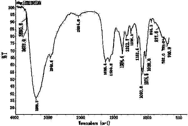 本發(fā)明多功能復(fù)合型水處理劑合成樹脂的接枝共聚物的紅外光譜分析,從圖1中可以看出,在3300-3500cm-1處為O-H伸縮振動(dòng)與N-H伸縮振動(dòng)重疊形成的多重吸收峰。在2946.5cm-1為次甲基的C-H收縮振動(dòng)吸收峰,在1636cm-1處為C=O的吸收峰,在1580.8cm-1處為-NH2的吸收譜帶,在1152.4cm-1處為C=S的特征吸收峰,在1093.8-1處為C-O的特征吸收峰。在1556.6-1處出現(xiàn)了C=N的特征吸收峰,表明了殼聚糖進(jìn)行了接枝,生成了目標(biāo)物。