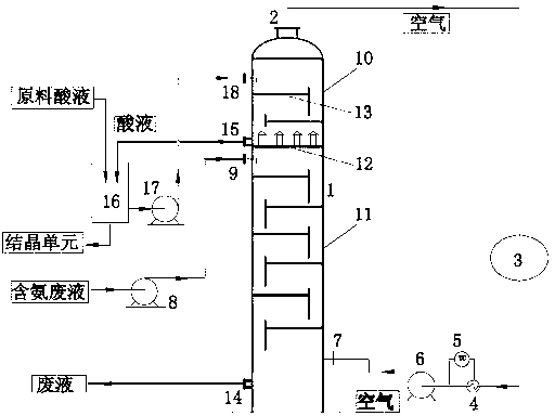 4. 一種氨氮廢水脫除工藝,該工藝采用權利要求1所述氨氮廢水脫除設備,并包括空氣循環工藝、廢液處理工藝和酸液循環工藝,所述空氣循環工藝是:空氣首先進入空氣儲罐,然后進入空氣加熱器,空氣加熱后,通過風機和空氣入口從吹脫塔底部送入吹脫段,穿過吹脫段后,通過斷塔盤送入上方的吸收段,之后空氣通過吸收段由塔頂的空氣出口進入空氣管路,最后送回空氣儲罐,然后開始下一次空氣循環,如此完成空氣循環利用;所述廢液處理工藝是:含氨廢液通過廢液泵從吹脫塔頂部的廢液入口進入吹脫段,并與進塔空氣逆流接觸,進行氣液傳質過程,處理后的廢液從吹脫塔底部的廢液出口排出;所述酸液循環工藝是:原料酸液通過酸液泵由酸液入口進入吸收段的頂部,與空氣逆流接觸,讓氨從空氣中轉移到酸液中,使含氨空氣得到凈化;反應后的酸液在斷塔盤上聚集后從吸收段底部的酸液出口出來,從酸液出口出來的循環酸液進入緩沖槽,在緩沖槽中循環酸液與原料酸液混合后,再經過酸液泵,送入吸收段,開始下一次除氨循環;同時緩沖槽中的酸液部分進入結晶工段,結晶析出硫酸銨。