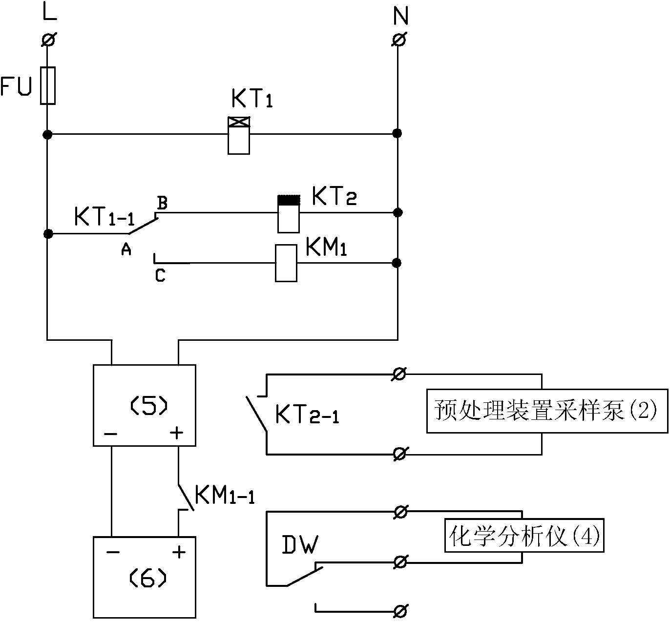 1.一種廢水污染源化學分析儀實時采樣運行控制系統,包括通過管道依次 相連的廢水污染源(1)、預處理裝置采樣泵(2)、預處理裝置儲水池(3)和化 學分析儀(4),其特征在于還包括控制電路(7),所述的控制電路(7)包括雙 時間繼電器KT1、繼電器KT2、繼電器KM1、交流直流轉換模塊(5)和單穩態模 塊(6),雙時間繼電器KT1的兩個驅動端分別和交流輸入電源的火線L、零線N 相連,交流直流轉換模塊(5)的兩個輸入端分別和交流輸入電源的火線L、零 線N相連,雙時間繼電器KT1的觸點開關KT1-1的公共端A和交流輸入電源的火 線L相連,觸點開關KT1-1的常閉端B和繼電器KT2的一個驅動端相連,觸點開 關KT1-1的常開端C和繼電器KM1的一個驅動端相連,繼電器KT2的另一個驅動 端及繼電器KM1的另一個驅動端均和交流輸入電源的零線N相連,繼電器KT2的 常開觸點開關KT2-1連接在預處理裝置采樣泵(2)的供電線路中,交流直流轉 換模塊(5)的負向輸出端和所述的單穩態模塊(6)的工作電壓輸入負極相連, 交流直流轉換模塊(5)的正向輸出端經繼電器KM1的常開觸點開關KM1-1和所述 的單穩態模塊(6)的工作電壓輸入正極相連,所述的單穩態模塊(6)的繼電 器常閉觸點開關DW和化學分析儀(4)的啟動控制端相連。