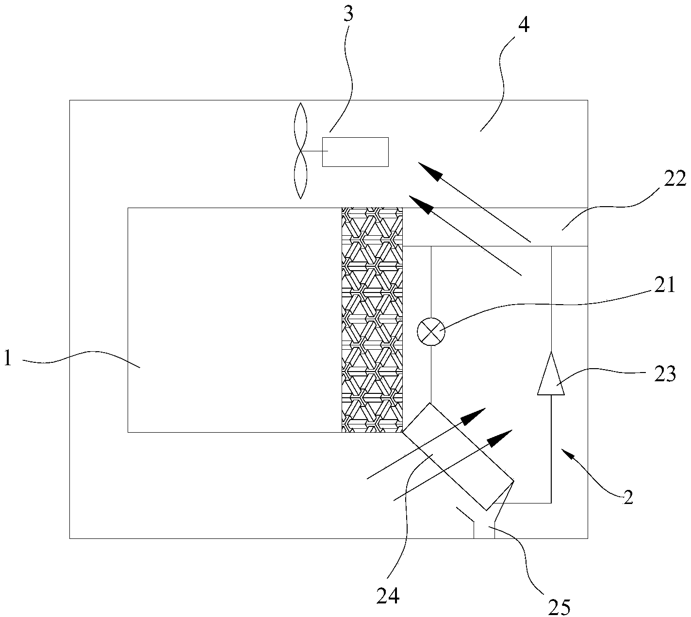 本實用新型解決其技術問題所采用的技術方案是:一種熱泵低溫污泥干化處理系統,包括干燥室、熱泵單元和內部設有循環風機的送風管道。干燥室上設有進料口和出料口,熱泵單元包括設有壓縮機、冷凝器、節流裝置和蒸發器的冷媒回路,送風管道的進氣口和出氣口均與干燥室接通,蒸發器和冷凝器沿氣體的流動方向依次設在送風管道內。