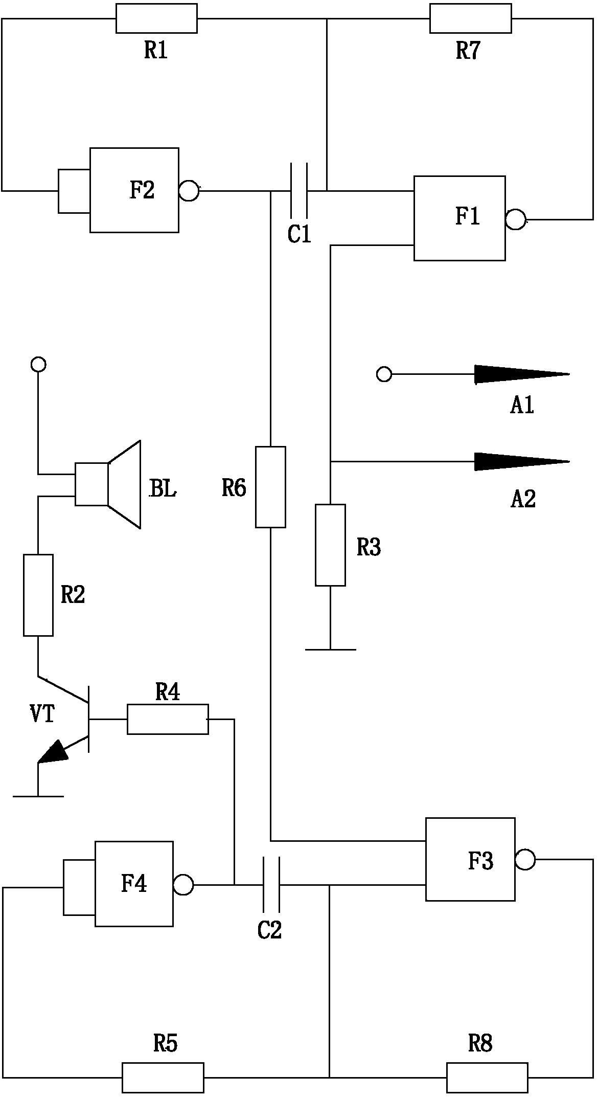 1.一種污水處理池的水流超速報警電路,其特征在于:包括第一電阻至第八電阻、第一電容、第二電容、三極管、報警器、第一探針、第二探針、第一與非門至第四與非門,所述第一探針接正極電源,所述第二探針的分別與第三電阻的第一端和所述第一與非門的第一輸入端連接,第三電阻的第二端接地,所述第一與非門的輸出端與第七電阻的第一端連接,第七電阻的第二端分別與所述第一電阻的第一端、所述第一與非門的第二輸入端和所述第一電容的第一端連接,所述第一電阻的第二端與第二與非門的輸入端連接,第二與非門的輸出端分別與所述第一電容的第二端和第六電阻的第一端連接,第六電阻的第二端與第三與非門的第一輸入端連接,第三與非門的輸出端與所述第八電阻的第一端連接,所述第八電阻的第二端分別與第五電阻的第一端、第三與非門的第二輸出端和所述第二電容的第一端連接,第五電阻的第二端與所述第四與非門的輸入端連接,所述第四與非門的輸出端分別與所述第二電容的第二端和第四電阻的第一端連接,第四電阻的第二端與所述三極管的基極連接,所述三極管的集電極接地,所述三極管的發射極與所述第二電阻的第一端連接,所述第二電阻的第二端與所述報警器的第一端連接,所述報警器的第二端接正極電壓。