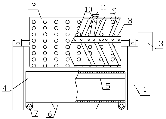 本實用新型操作時:通過電機帶動轉筒轉動將轉筒內的蚯蚓糞通過篩孔直接掉落到收集框內,回收的蚯蚓就在轉筒內,由于掉入收集框內的蚯蚓糞可能還會參雜一些蚯蚓就利用振動泵工作,通過篩網進行再一次的回收,保證將蚯蚓糞內的蚯蚓能夠全部回收;等全部回收結束后打開封蓋通過連接管向支撐軸內進行送水,通過支撐軸表面的通孔進行灑水對轉筒進行清洗。