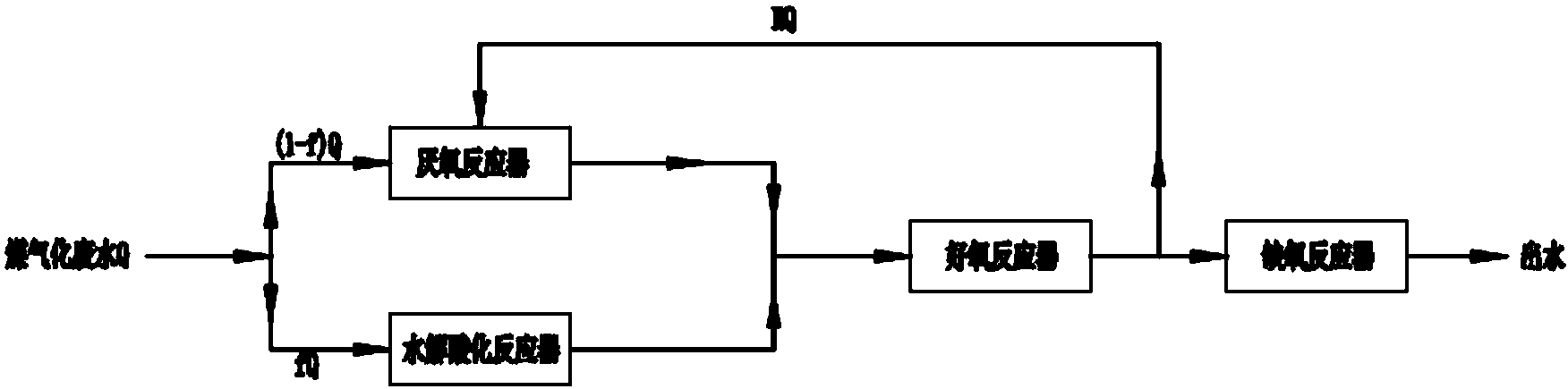實現本發明目的所采用的技術方案是:一種好氧出水回流至厭氧反應器稀釋并厭氧氨氧化處理煤氣廢水的方法,它包括厭氧反應器、水解酸化反應器、好氧反應器、缺氧反應器,將總水量為Q的原廢水量乘以0%-50%分流系數f的水量直接進入水解酸化反應器;剩余(1-f)Q水量以及從好氧反應器回流的水量RQ進入厭氧反應器,分流了進入水解酸化反應器的氨氮進入好氧反應器后在好氧硝化菌的作用下生成硝酸鹽氮和亞硝酸鹽氮,然后回流進入厭氧反應器在厭氧氨氧化菌的作用下,用氨氮將其還原為氮氣,其特征在于:將好氧反應器出水以0%-100%的回流比R回流至厭氧反應器。