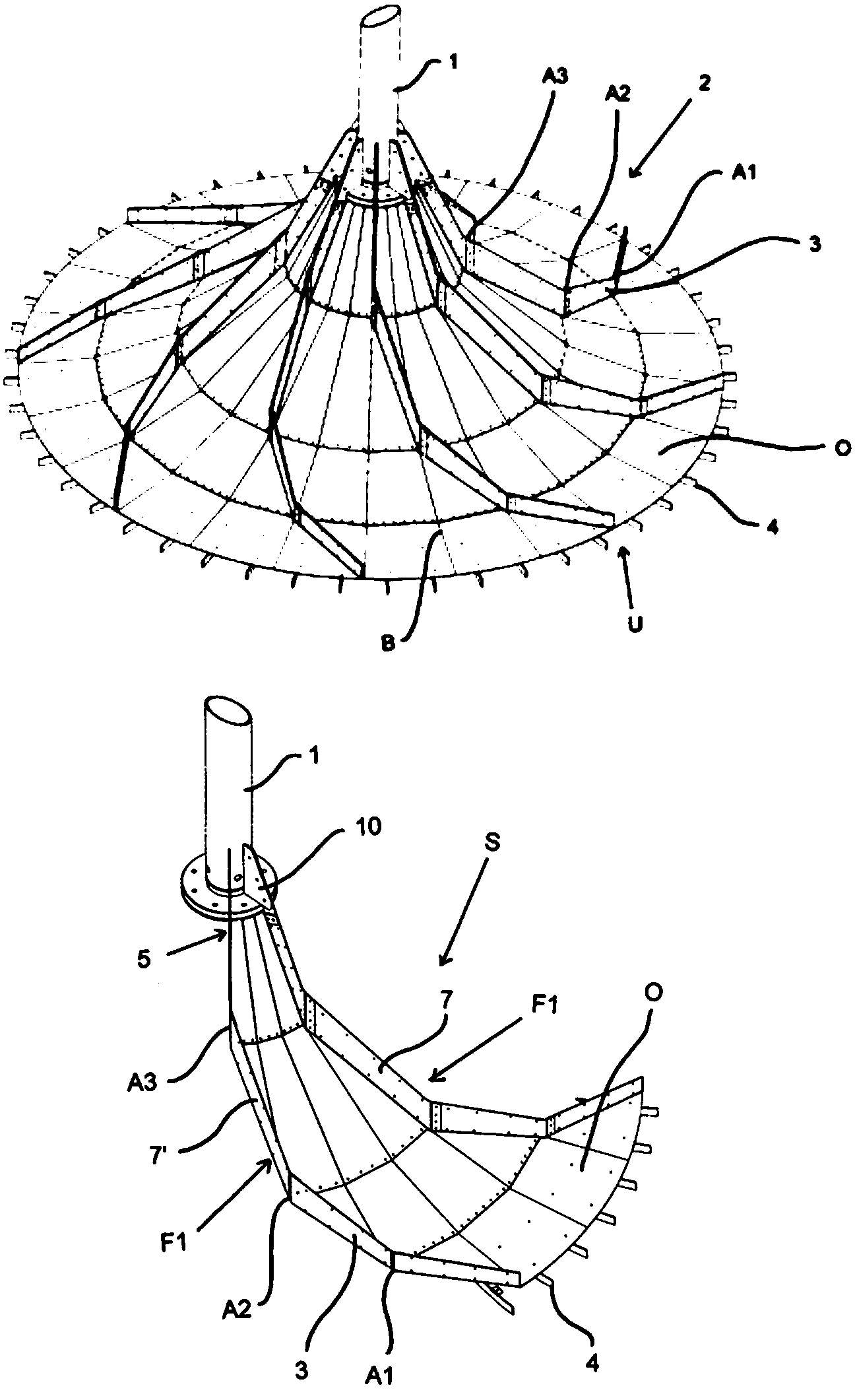 11.根據(jù)前述權(quán)利要求中任意一項所述的攪拌體,其中所述接合區(qū)由朝向所述部段(S,S′)的頂面(O)彎曲的板材段(7,7′)構(gòu)成。