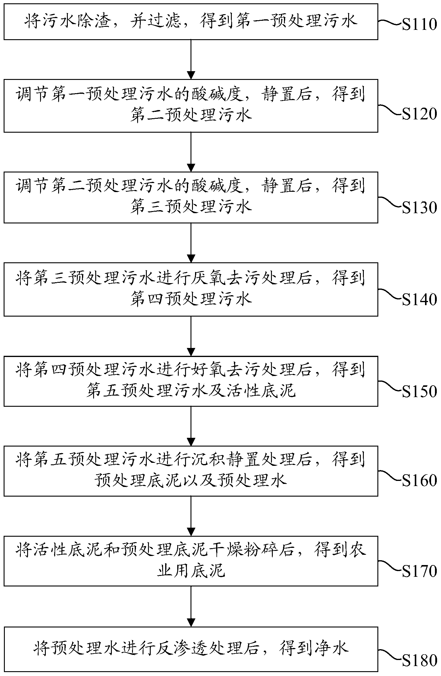 上述污水處理方法通過先將污水進行兩次酸度調節,去除污水中的重金屬 后,再分別通過厭氧去污處理、好氧去污處理,在微生物的作用下,使污水中 的有機物發生降解,有效地降低了污水的化學需氧量及生化需氧量,同時也可 以殺死污水的病原菌、病毒和寄生蟲卵等,然后再經過沉積分離、反滲透處理, 去除污水中鹽類等雜質,使其達到生活飲用標準,有利于資源的回收利用。由 于先對污水進行了重金屬去除處理,由此在后續的好氧去污處理產生的污泥也 不會帶入重金屬,使得到的污泥經干燥粉碎后即可用作農業底泥,減少了污泥 的二次污染,有利于環保及資源的回收利用。