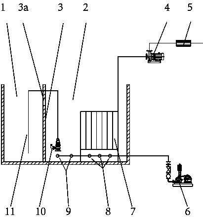 1.一種污水處理系統,包括集水池、進水管、出水管,集水池通過豎向的隔板(3)分為兩個池子;出水管上依次設有吸水泵(4)和紫外消毒裝置(5),其特征在于:所述集水池通過隔板(3)分為缺氧池(1)和MBR好氧池(2);所述隔板(3)上部有方孔(3a);所述的MBR好氧池(2)底部設置有MBR板式膜組件(7),所述出水管連接在該MBR板式膜組件(7)上;所述MBR板式膜組件(7)上配備曝氣管路A(8),MBR好氧池(2)配備有單獨的曝氣管路B(9),所述曝氣管路A(8)和曝氣管路B(9)共用一臺鼓風機(6)。