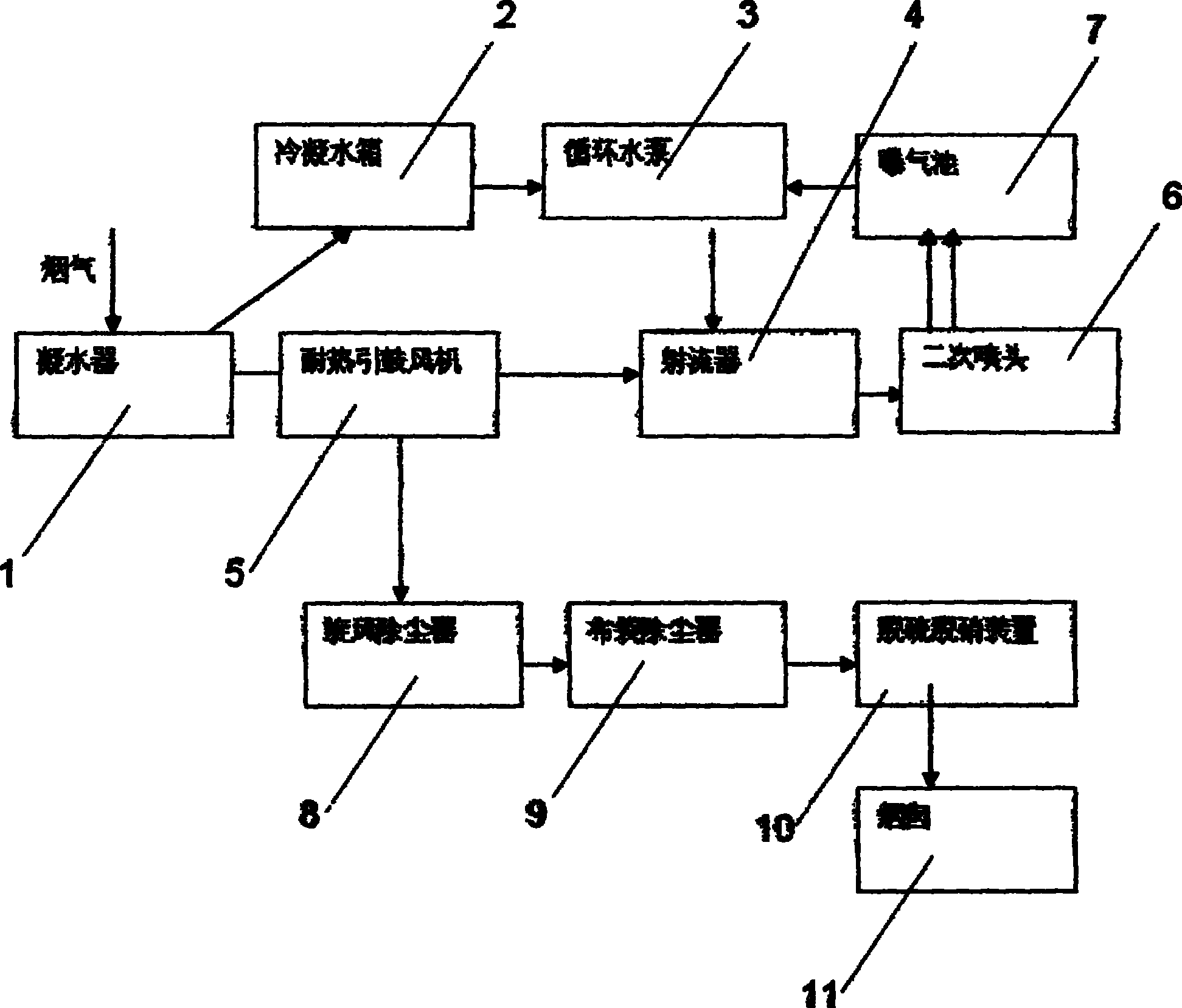 為實現上述第二目的,本發明采取的技術方案為:一種污泥 焚燒后的煙氣凈化和回用設備,其包括凝水器、冷凝水箱、循環 水泵、射流器、耐熱引鼓風機、二次噴頭、曝氣池、旋風除塵器、 布袋除塵器、脫硫脫硝裝置以及煙囪;其中,所述凝水器分別和 冷凝水箱、耐熱引鼓風機連接;所述冷凝水箱、循環水泵、射流 器依次連接;所述耐熱引鼓風機亦連接至射流器上;所述耐熱引 鼓風機還依次和旋風除塵器、布袋除塵器、脫硫脫硝裝置、煙囪 連接;所述二次噴頭連接至射流器上,其將水噴射入曝氣池;所 述曝氣池連接至循環水泵。