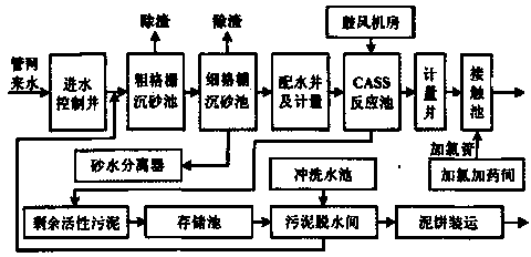 所述二級污水處理設備包括與沉砂池連接的砂水分離器,與CASS反應池連接的存儲池,以及與存儲池連接的污泥脫水間。