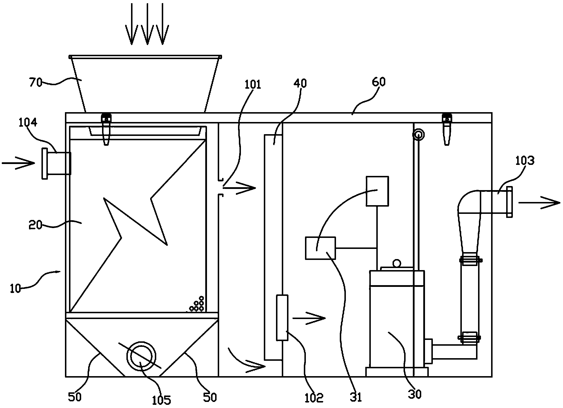 6.如權(quán)利要求1所述的一種餐飲泔腳及油污水分離兩用提升器,其特征在于:所述除渣腔室(11)底部設(shè)兩塊相向的斜板(50),所述兩相向斜板(50)呈漏斗狀,所述除渣腔室(11)底部側(cè)壁上開設(shè)排渣口(105),所述排渣口(105)設(shè)閥。