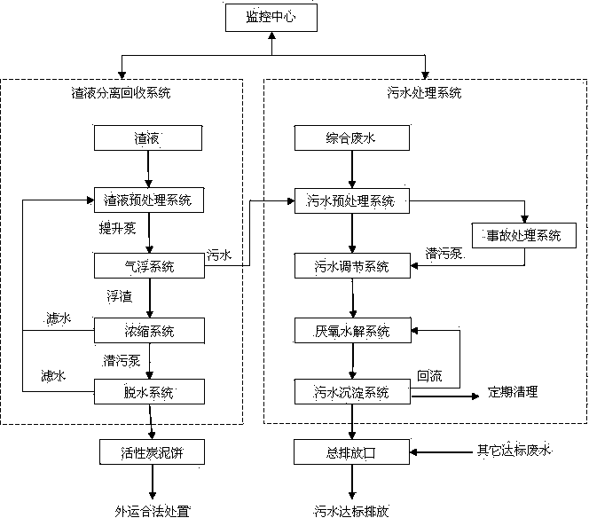 所述的渣液分離回收系統(tǒng)包括渣液預處理系統(tǒng)、氣浮系統(tǒng)、濃縮系統(tǒng)和脫水系統(tǒng),所述 的渣液預處理系統(tǒng)的入口與渣液排放口連接,渣液預處理系統(tǒng)的出口與氣浮系統(tǒng)的入口連接, 氣浮系統(tǒng)的污水出口與污水處理系統(tǒng)的入口連接,氣浮系統(tǒng)的浮渣出口與濃縮系統(tǒng)的入口連 接,濃縮系統(tǒng)的濾水出口與渣液預處理系統(tǒng)的入口連接,濃縮系統(tǒng)的濃漿渣出口與脫水系統(tǒng) 的入口連接,脫水系統(tǒng)的濾水出口也與渣液預處理系統(tǒng)的入口連接,脫水系統(tǒng)還輸出壓縮后 的濾渣泥餅。
