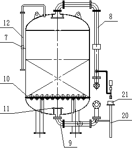 1.煤礦廢水預(yù)處理裝置,其特征在于:包括第一罐體(7)、第一進水管(8)、第一出水管(9)和多孔板(10),所述罐體(7)頂部設(shè)置有進水管(8),底部設(shè)置有出水管(9),其內(nèi)部設(shè)置有濾料層(12)和多孔板(10),所述濾料層設(shè)置在多孔板(10)的上方,所述出水管(9)延伸至罐體(7)的內(nèi)部,出水管(9)的頂部蓋有防沖板(11),所述罐體(7)的頂部還設(shè)置有排氣管(12)。