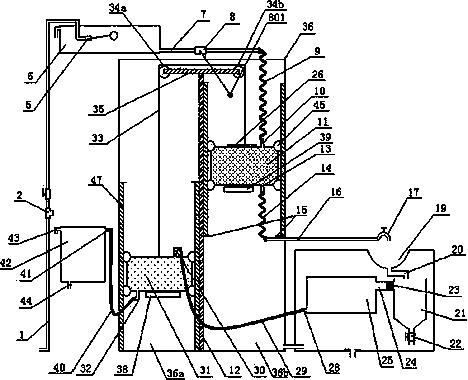 1.一種利用重力提升廢水的裝置,其特征在于:包括升降柜(36)、低位廢水儲水箱(25)、高位廢水儲水箱(42)、儲水動力箱(11)、廢水提升箱(31),所述升降柜(36)通過承重支架(12)分為豎直平行的第一箱體(36a)和第二箱體(36b),承重橫梁(35)固定在承重支架(12)的上端,設置在第一箱體(36a)中的廢水提升箱(31)和設置在第二箱體(36b)中的儲水動力箱(11)通過纜繩(33)繞過固定在承重橫梁(35)上的導向定滑輪(34a、34b)與儲水動力箱(11)連接,所述儲水動力箱的進水口(10)與自來水供水管(7)通過第一軟管(9)連通,并在自來水供水管(7)上設置水閥(8),所述儲水動力箱(11)的出水口(13)依次與用水管道(16)、水龍頭(17)通過第二軟管(14)連通,所述水龍頭(17)下設盆池(19),盆池(19)下部的排水管(20)連通廢水沉淀槽(21),廢水沉淀槽(21)通過管道(24)與低位廢水儲水箱(25)連通,低位廢水儲水箱的出水口(28)通過第三軟管(29)與廢水提升箱的進水口(30)連通,廢水提升箱的出水口(32)通過第四軟管(40)與高位廢水儲水箱的進水口(41)連通;廢水提升箱的進水口(30)的最低位置低于低位廢水儲水箱的出水口(28),此時儲水動力箱(11)向上頂起水閥(8)的開關球頭(801);與用水管道(16)平行的第二箱體(36b)內壁處設置止動點(15)作為儲水動力箱(11)下滑的最低點;所述廢水提升箱(31)的空箱重力大于儲水動力箱(11)的空箱重力以及相關機構的重力和摩擦力,儲水動力箱(11)的容積大于廢水提升箱(31)的容積,儲水動力箱(11)注滿水后產生的重力大于注滿水的廢水提升箱(31)產生的重力以及相關機構的重力和摩擦力;其中,相關機構的重力和摩擦力包括第一軟管(9)、第二軟管(14)、第三軟管(29)、第四軟管(40)的重力和摩擦力,纜繩(33)、導向定滑輪(34a、34b)、定位輪(45)的重力和摩擦力,水閥(8)的開啟阻力。