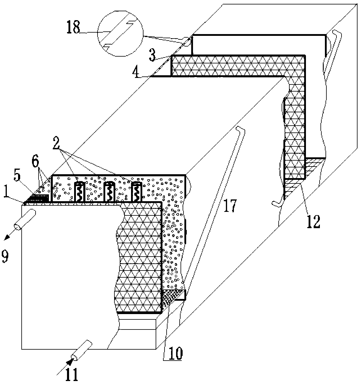 所述裝置的首端底部設置有廢水進水口13,尾端頂部設置有處理后廢水出 水口9,裝置內靠近所述廢水出口9處設置有催化劑截留槽5,所述廢水經裝置 底部廢水進水口進入陽極室后,通過陽極連通管依次進入相鄰陽極室進行光電催 化處理后,最后由流經催化劑截留槽5后通過廢水出水口9排出。