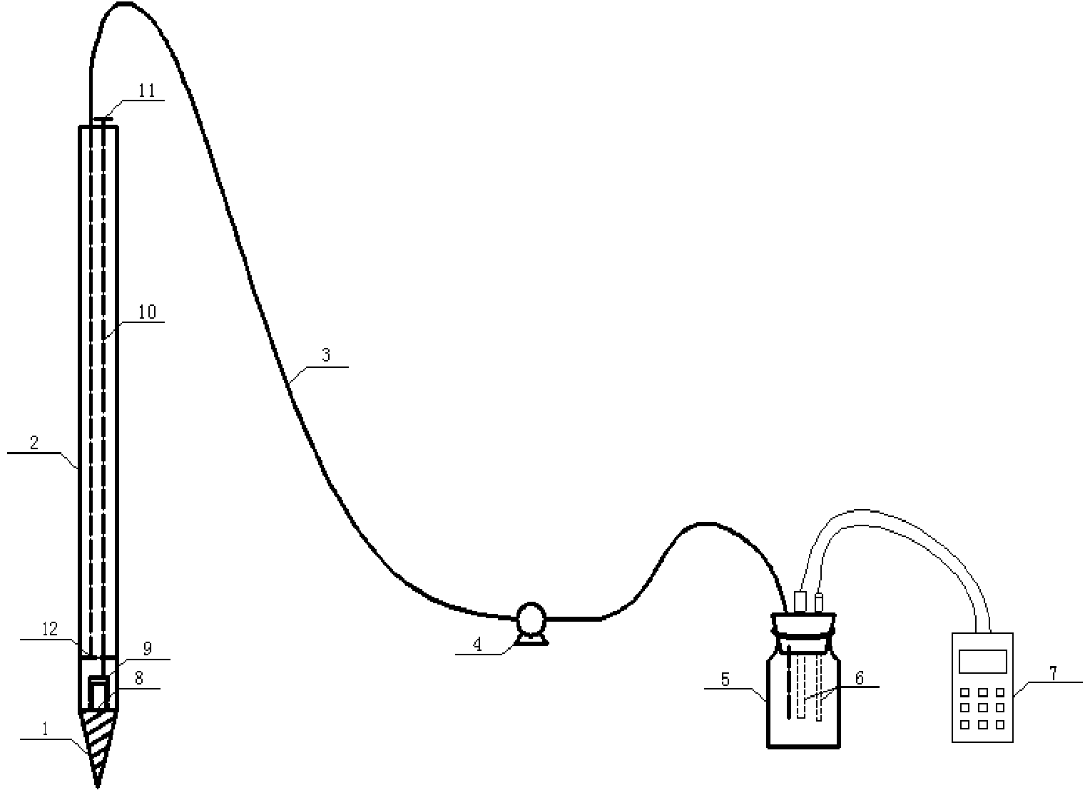 圓錐形鉆頭(1)底面內(nèi)直徑32mm,高100mm,鉆頭表面光滑;取樣桿(2) 內(nèi)直徑32mm,高1.5-2.5m,距取樣桿底部20cm處,開有邊長為20mm的矩形孔 作為取樣口(8),矩形取樣口(8)再由緊貼內(nèi)壁的矩形擋板(9)密封,矩形 擋板(9)的邊長為30mm,其頂部連接直徑3mm的金屬桿(10),金屬桿(10) 頂端接合塑料拉手(11),取樣桿(2)底部往上50mm處設有孔板濾網(wǎng)(12), 孔板濾網(wǎng)(12)上部粘連硅膠管(3);硅膠管(3)規(guī)格為φ8mm×11mm,硅 膠管(3)的另一端通過蠕動泵(4)與集水裝置(5)連接;蠕動泵(4)在硅 膠管(3)的末端,(型號為BT300蠕動泵);密封在集水裝置(5)內(nèi)的探頭(6) 與儀表(7)構(gòu)成在線測試裝置,探頭(6)與儀表(7)連接。