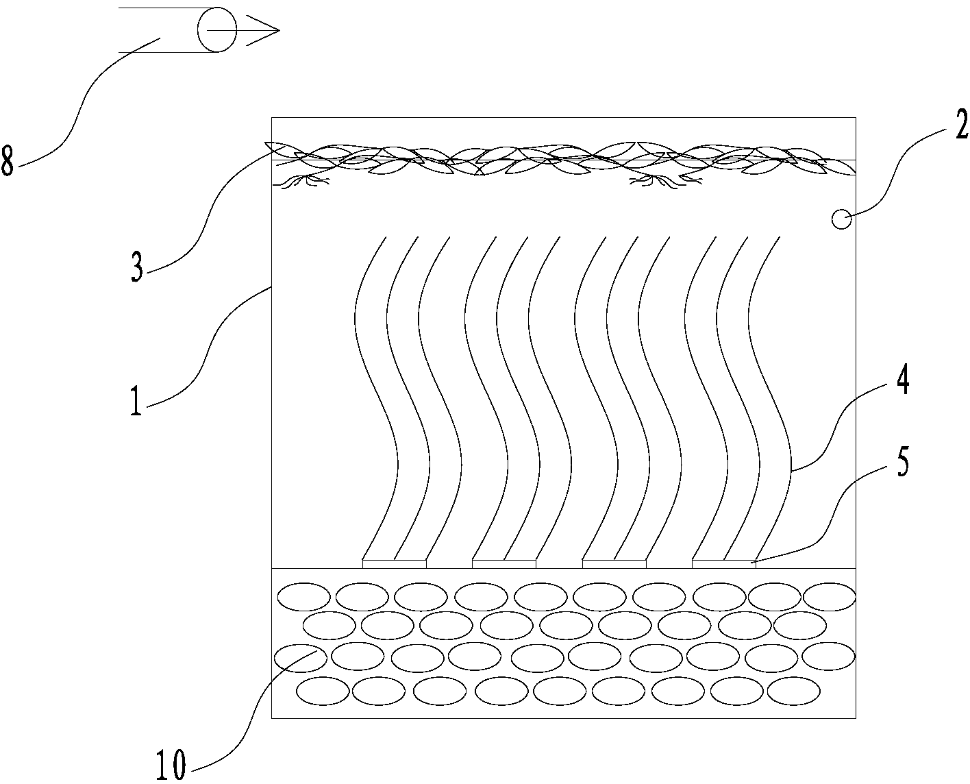 1.三層結構污水凈化槽,包括一個頂面敞口的槽體(1),其側壁上部開有排水孔(2),其特征是所述的槽體(1)內腔中自上而下依次設置植物層(3)、吸附層和碎石層(10),植物層(3)由可漂浮的浮水植物組成,吸附層由生物漂帶(4)組成,碎石層(10)由鋪設在槽體內腔底面上的碎石堆砌組成。