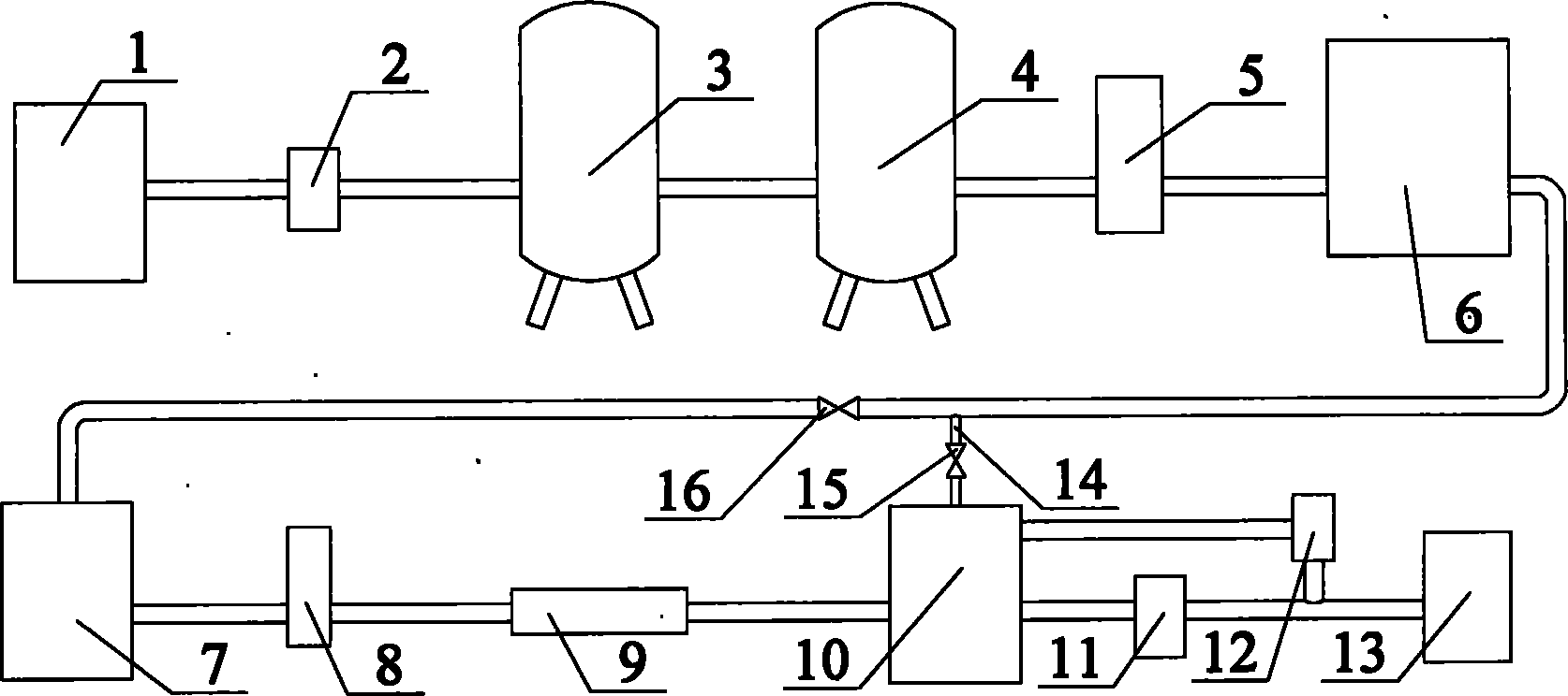 1.一種超濾和部分納濾并聯的集中飲用水處理裝置,包括借助主管路 依次連接的原水箱(1)、原水泵(2)、多介質過濾器(3)、活性炭過濾器 (4)、保安過濾器(5)、超濾裝置(6)、中間水箱(7)、納濾增壓泵(8)、 納濾裝置(9)、產水箱(10)、供水泵(11)、飲用水塔(13)、進口與產水 箱(10)連通出口連接在供水泵(11)和飲用水塔(13)之間的二氧化氯 發生器(12)、及控制裝置,其特征在于:所述的飲用水處理裝置還包括一 端連接在超濾裝置(6)和中間水箱(7)之間、一端與產水箱(10)連通 的產水管路(14)、及設置在產水管路(14)上與控制裝置連接的產水控制 閥(15)。