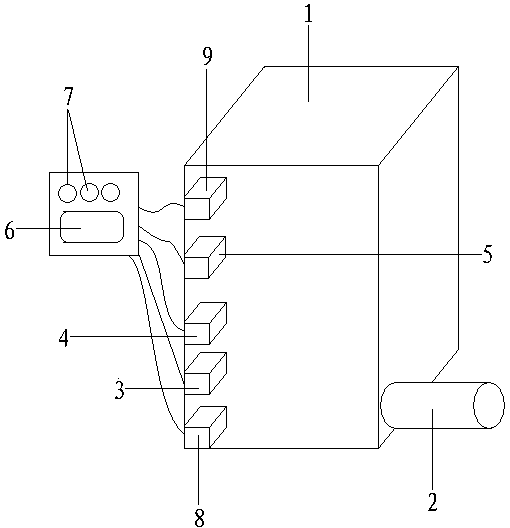本實用新型的有益效果是:本實用新型提供了一種用于顯影液廢水的收集裝置,不僅可以有效及時的將顯影液生產時產生的廢水收集起來,而且可以根據廢水水位的高低來進行警示或警報,并及時的進行抽水和處理,功能多樣、方便使用。